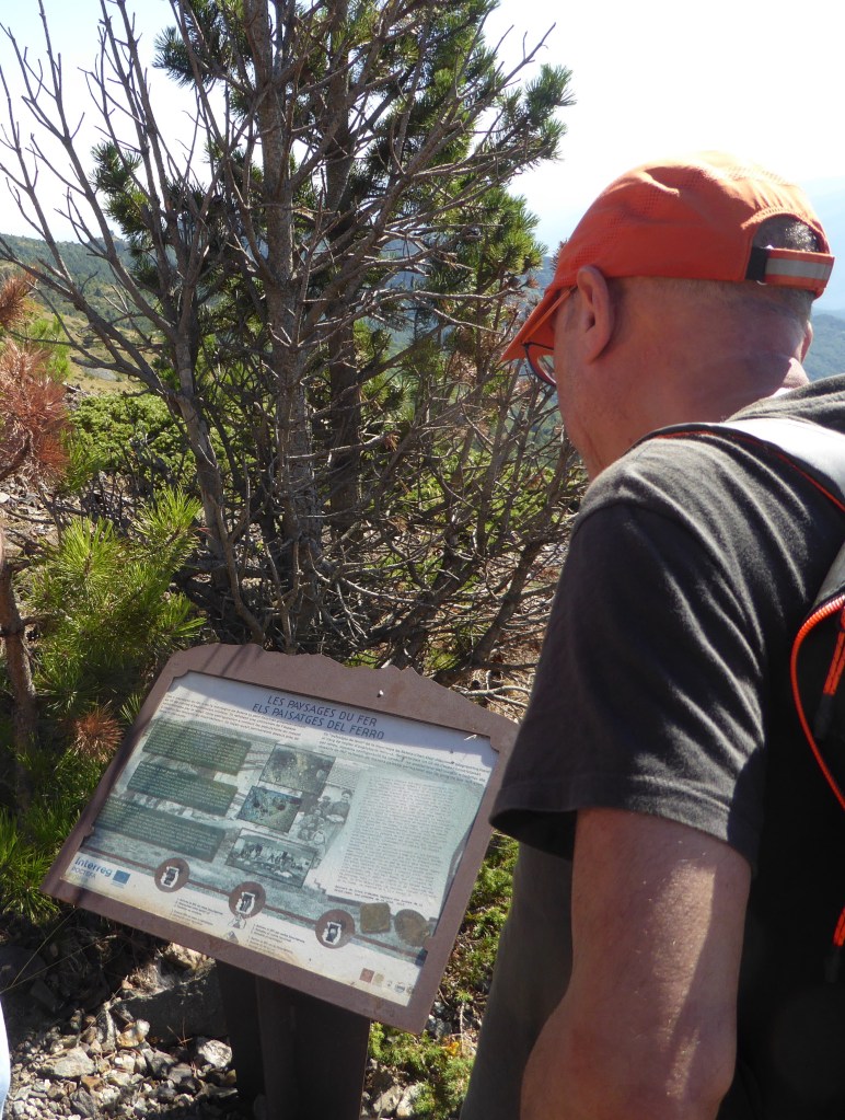 Aquí s’acaba la carretera asfaltada per la qual cosa anem a peu, guiats pels companys francesos, per una pista de terra fins a una gran esplanada situada a 1.500 metres d’alçada i oberta als magnífics paisatges de l’Alt Vallespir on hi pasturen vaques i ovelles. Els vessants de les muntanyes que ens envolten estan plenes de boques de mines amb els seus corresponents terregalls. Així que fem cap al terregall més proper, on hi trobem un altre plafó informatiu de la història de les mines.
