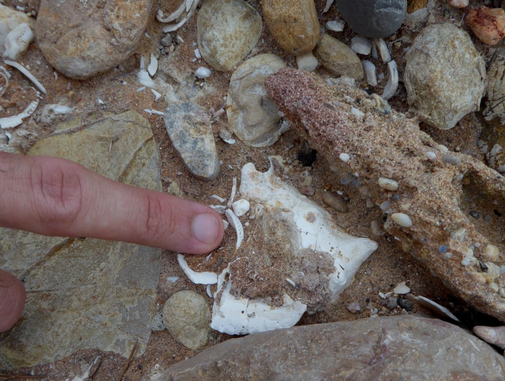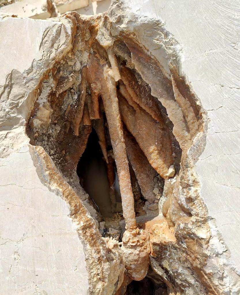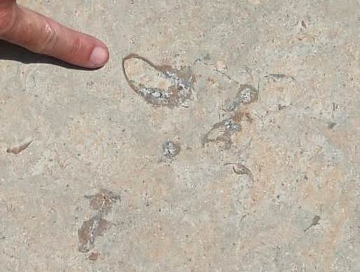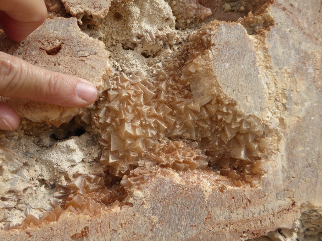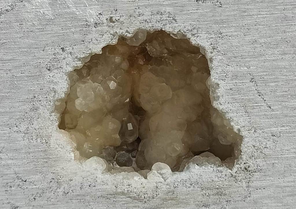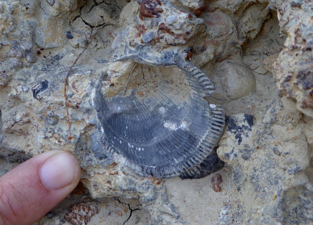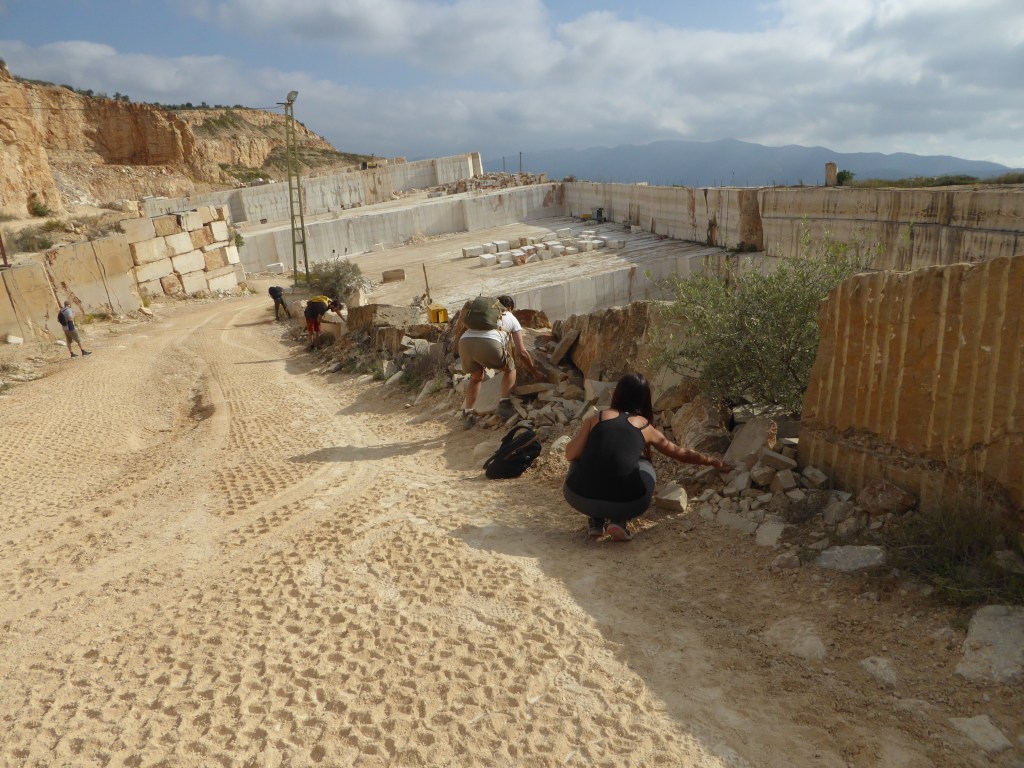 Als marges de la rampa d’accés a la pedrera, i sota un sol de justícia per a variar, podem picar i endur-nos algunes mostres de calcàries amb geodes de calcites, espeleotemes que apareixen en zones carstificades, calcàries fosques que contenen matèria orgànica i també podem veure un paquet fossilífer intercalat amb bonics lamel·libranquis.