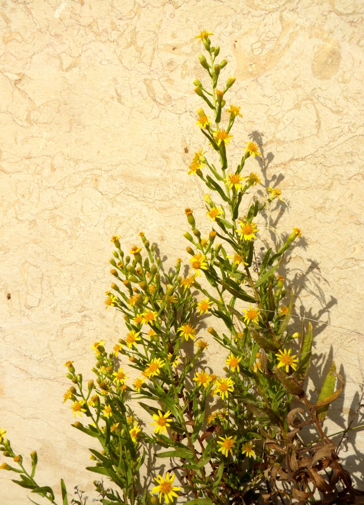 Als peus d’aquests grans blocs rocosos hi creix una planta de petites flors grogues i molt típica d’aquests ambients mediterranis. Es tracta de l’olivarda (Inula viscosa), la qual dona una nota de color a aquest indret tan petri.
