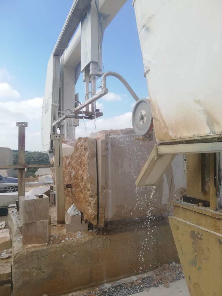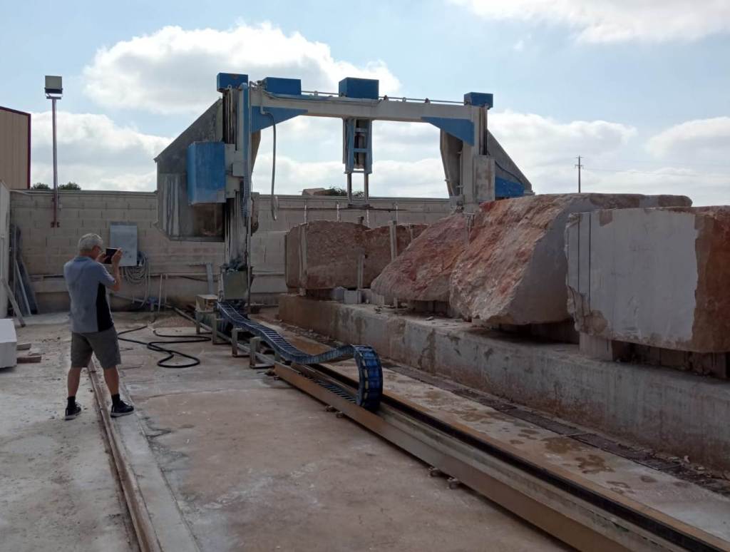 Després anem a veure la màquina que, amb un cable d’acer recobert de puntes de diamant, talla els blocs a lloses com si fossin un pa de motlle. I també ens passegem per entre aquestes “llesques” agrupades, cadascuna segons les seves característiques, i a punt de ser traslladades a la fàbrica.