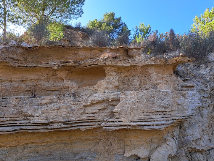 En aquest aflorament podem veure unes margues blaves dipositades durant la transgressió marina del Pliocè que tingué lloc després de l’anomenada crisi messiniana durant la qual es va assecar quasi tota la Mediterrània. La cosa curiosa és que entre les margues apareixen intercalats petits nivells de gresos, de caràcter turbiditic però dipositats a molt poca fondària. També s’observa una crosta ferruginosa molt bioturbada amb abundant fauna de bivalves, algues incrustants i foraminífers.