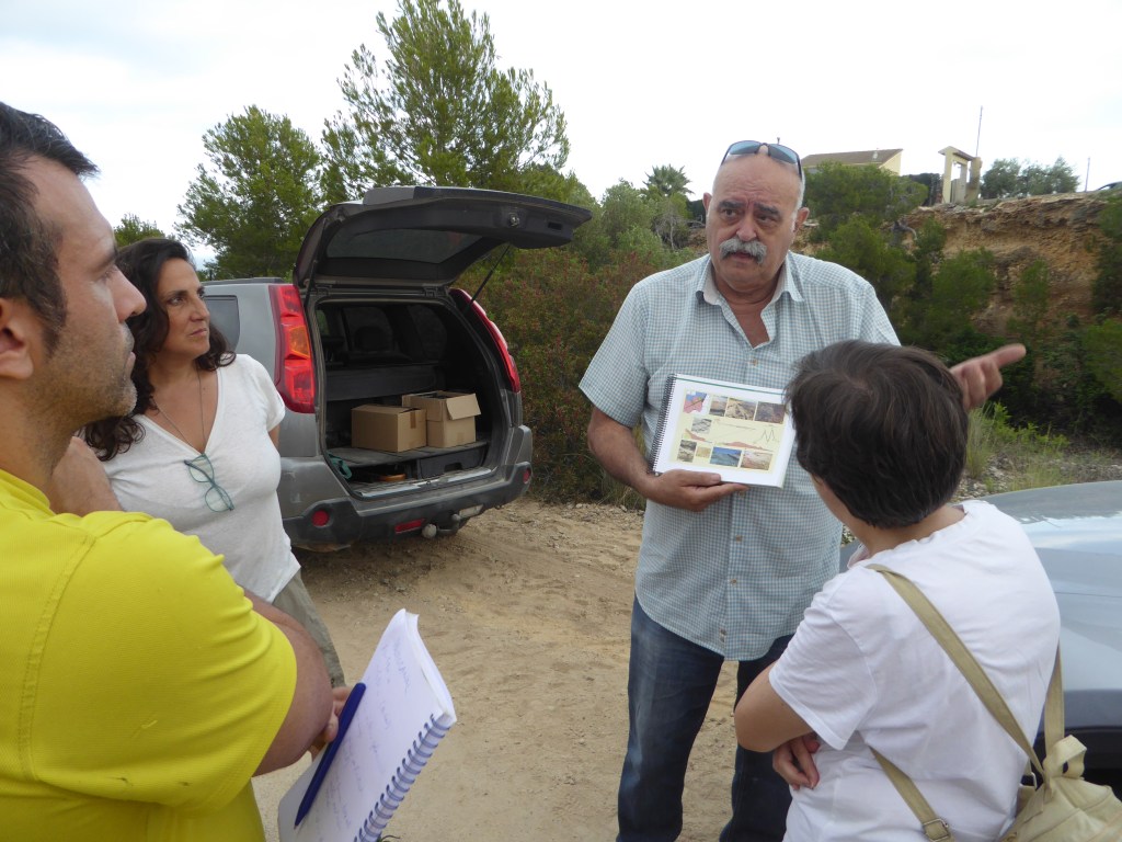 Dit i fet; quan acabem de dinar i sense perdre més temps ens desplacem als afores de Tortosa, al vessant sud de la Serra del Boix, on hi havia hagut unes explotacions d’argiles anomenades els Argilers d’Anguera. Aquest és un espectacular aflorament que l’Álvaro Arasa sempre té per a portar a la gent que s’apunta a les seves sortides geològiques pel Baix Ebre i la Ribera d’Ebre.