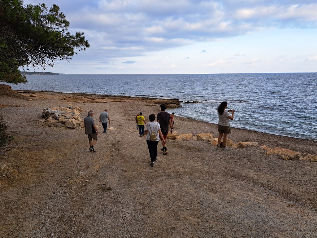 Després ens traslladem tots plegats a la platja del Perelló, un xic més al nord del Cap Roig, on apareix un nivell de graves que contenen còdols paleozoics. I això s’interpreta com una antiga desembocadura del riu Ebre del Tortonià-Messinià (Miocè superior).