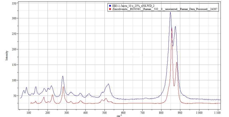 La seva identificació s’ha realitzat a través d’anàlisi Raman. A la següent figura es pot comprovar el seu perfecte encaix amb l’espectre d’una mostra de zincolivenita de la base de dades RRUFF.