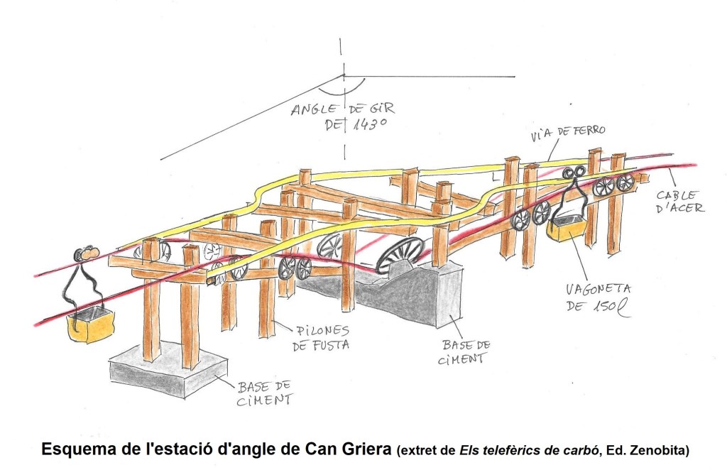 El telefèric era d’un sol cable, suportat per torres de fusta construïdes sobre bases de ciment, i no necessitava cap motor per al seu funcionament ja que la gravetat s’encarregava de fer baixar les vagonetes plenes i fer pujar les vagonetes buides en un circuit circular sense aturador. L’única cosa que calia era tenir un bon sistema de frenada i unes gàbies plenes de pedres per a mantenir el cable ben tensat.