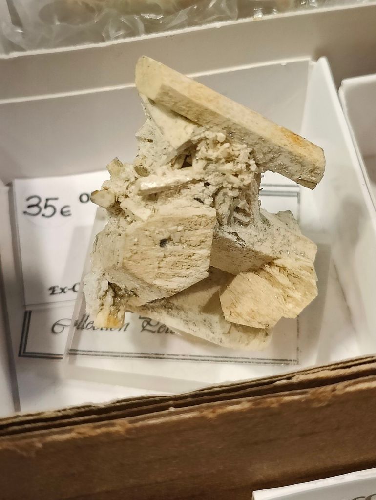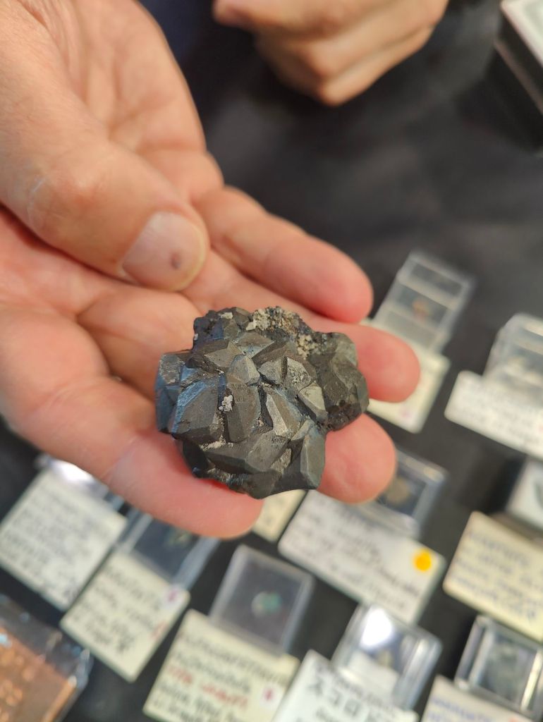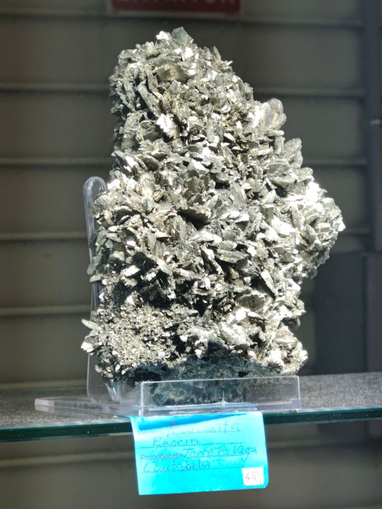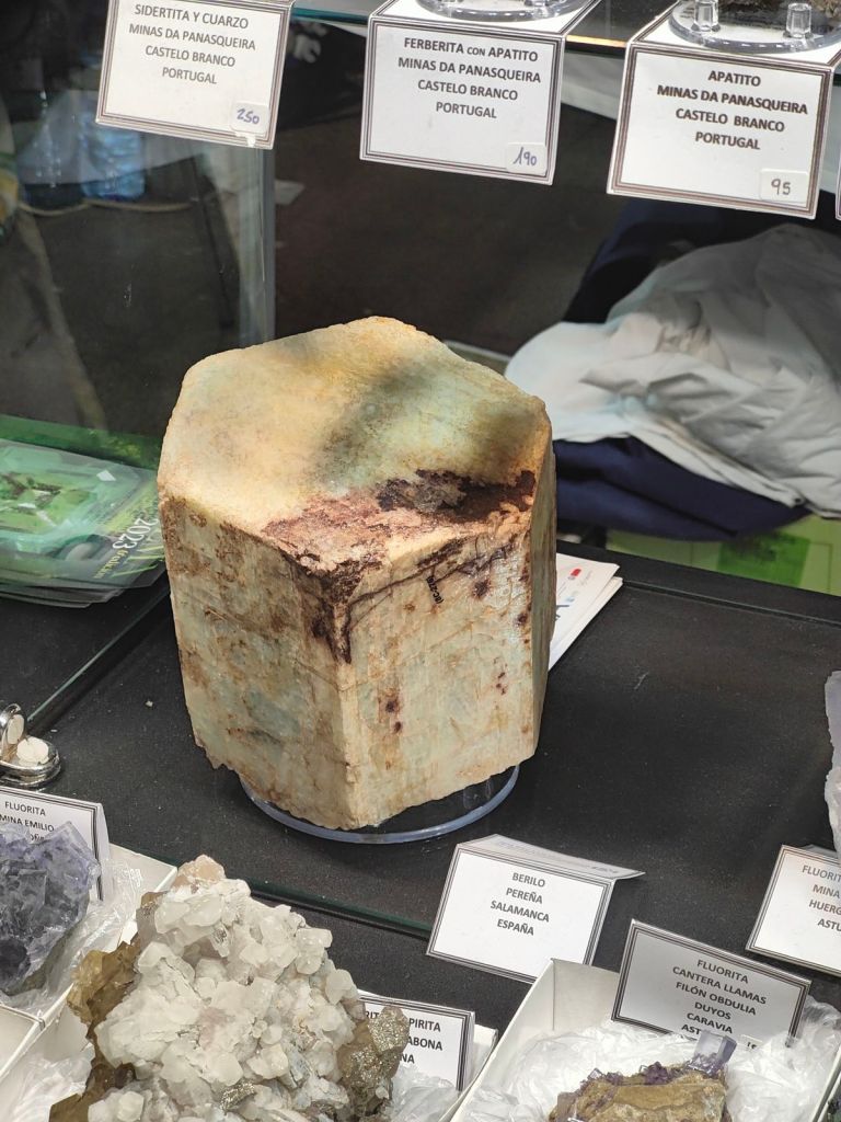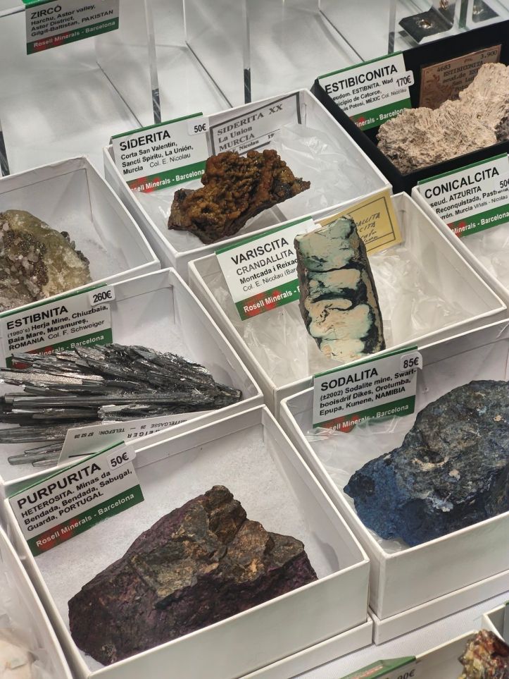 Del que es va poder veure em van cridar l’atenció: mostres de fenaquita d’A Franqueira, Pontevedra, localitat molt més coneguda pels seus berils; galena octaèdrica de la pedrera de Bakio, Biscaia; unes boniques conicalcocites de Fiñana, Almeria; o una bonica mostra d’aragonita sobre dolomita d’Ojos Negros, Terol, que era novetat d’aquest any. També alguns minerals clàssics de bona una mida i de localitats actualment no accessibles com ara marcassita de Reocín, Cantàbria; beril de Pereña, Salamanca; o quars fumat de Cerro Muriano, Còrdova. La venda de col·leccions antigues també va permetre veure cassiterites de diverses localitats o les clàssiques mostres de vivianita de la corta “Brunita”, per exemple.