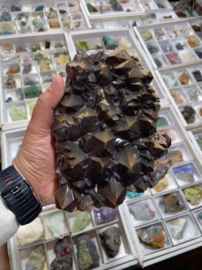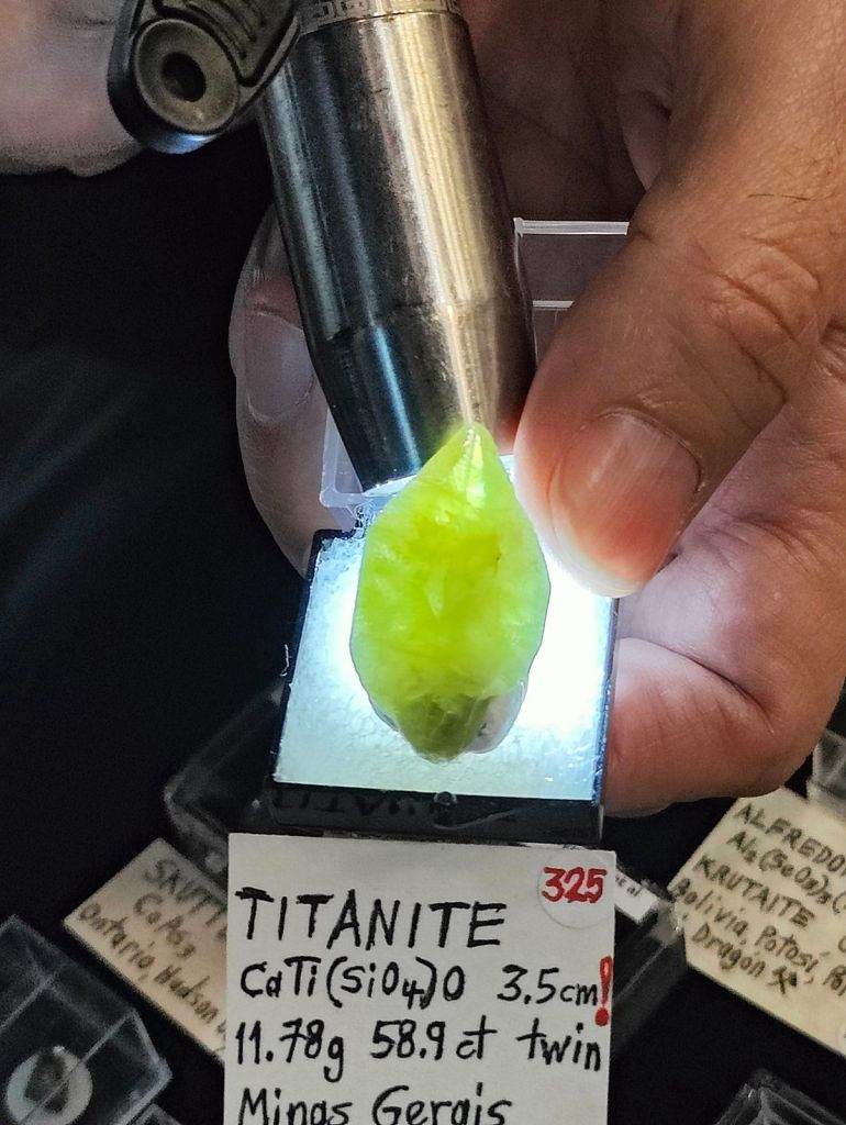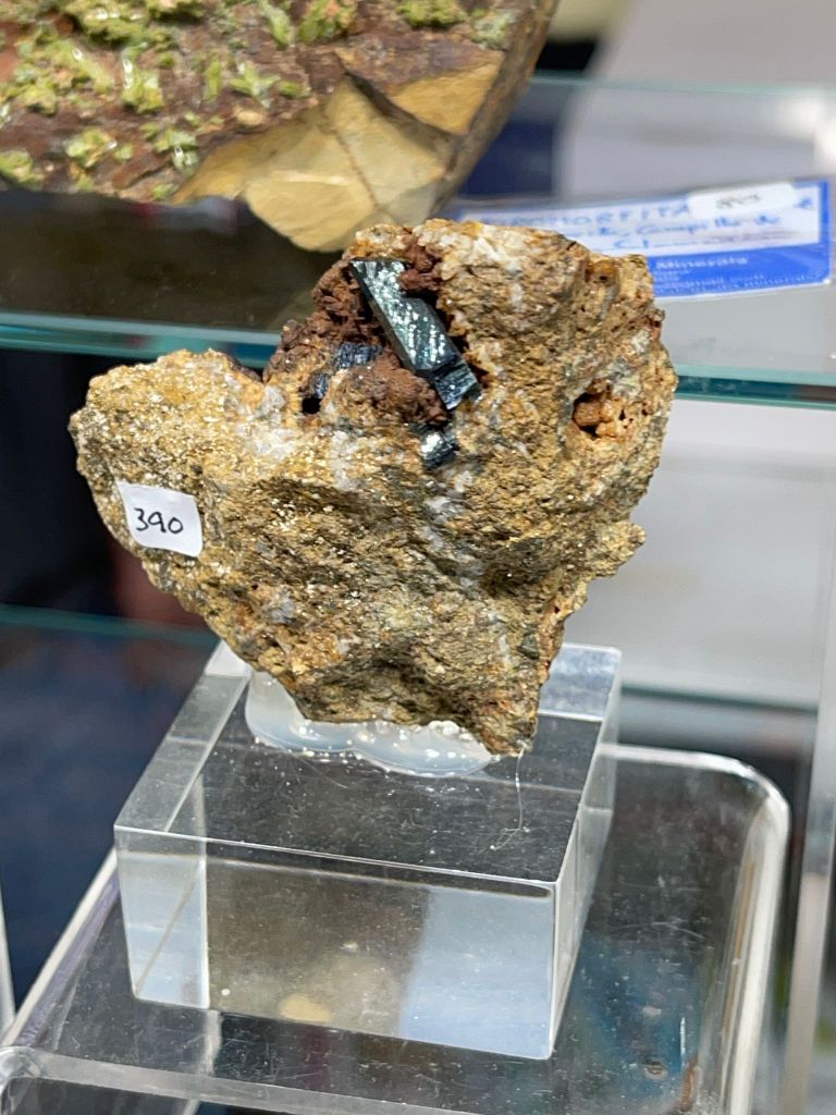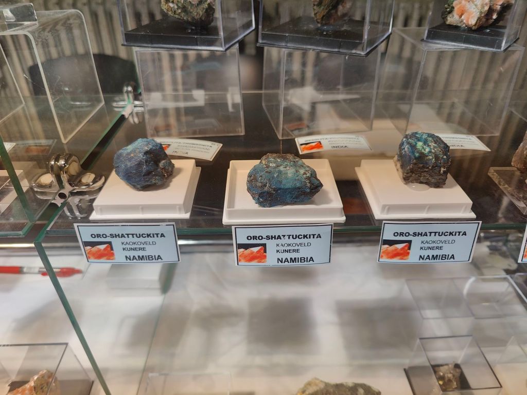 Com sempre, no van faltar minerals d’arreu del món: de l’Iran, andradita amb hedenbergita, de Gachin Salt, i mostres de granat amb andradita, dels Monts Belqueys. D’Afganistan, escapolita de la vall Kokcha; i del Kazakhstan, un exemplar de bornita molt ben cristal·litzat. També destacava un bon assortit de minerals de Namíbia: ortoclasa, beril (varietat aiguamarina) i boltwoodita, d’Erongo; a més d’unes bones mostres d’or amb shattuckita de Kaokoveld. També del continent africà, calcita cobaltífera amb kolwezita de la mina Mashamba, R.D. del Congo; o un exemplar de les sempre curioses tanzanites d’Arusha, Tanzània. D’altres indrets, destacar una mostra de quars amb terminació pinacoidal de la mina Poema, Bolívia; del Brasil, beril heliodor de Padre Pariso o una peça de titanita amb cristalls translúcids de molt bona mida; ametista d’un indret poc conegut com és Nyiri, Hongria, o una mostra de les clàssiques però no per això menys espectaculars esfalerites (varietat cleofana) de Madan, Bulgària, que tot i ser força grans, es veien ben translúcides amb una bona il·luminació.
