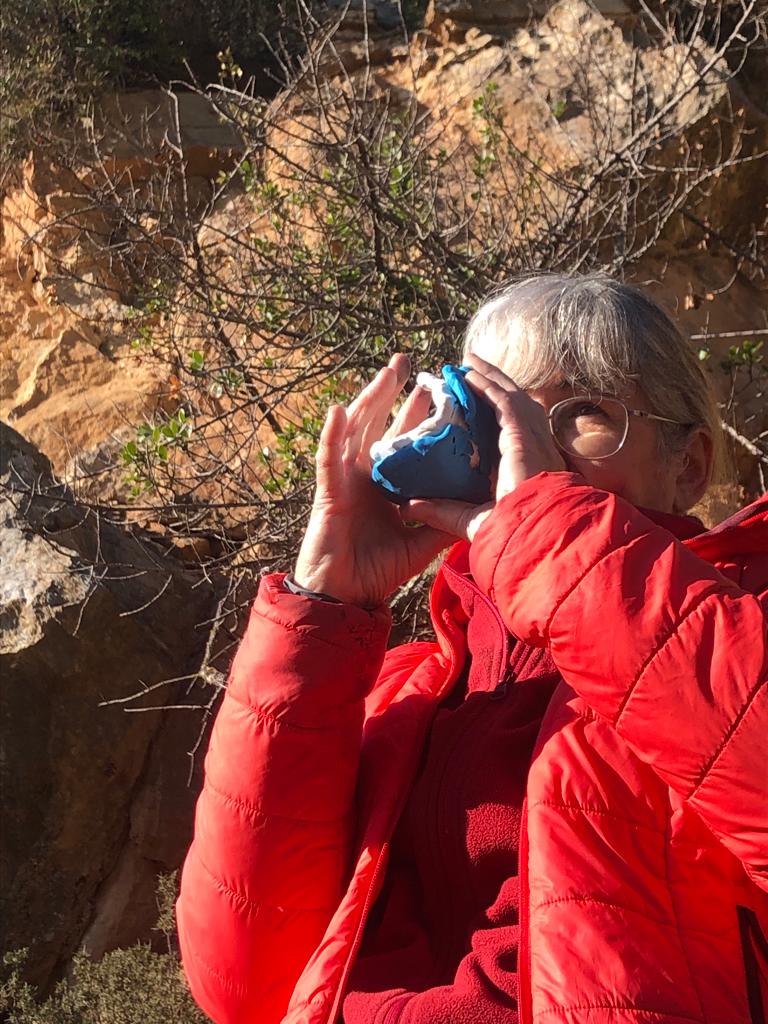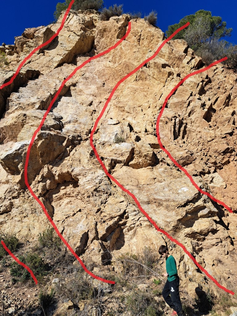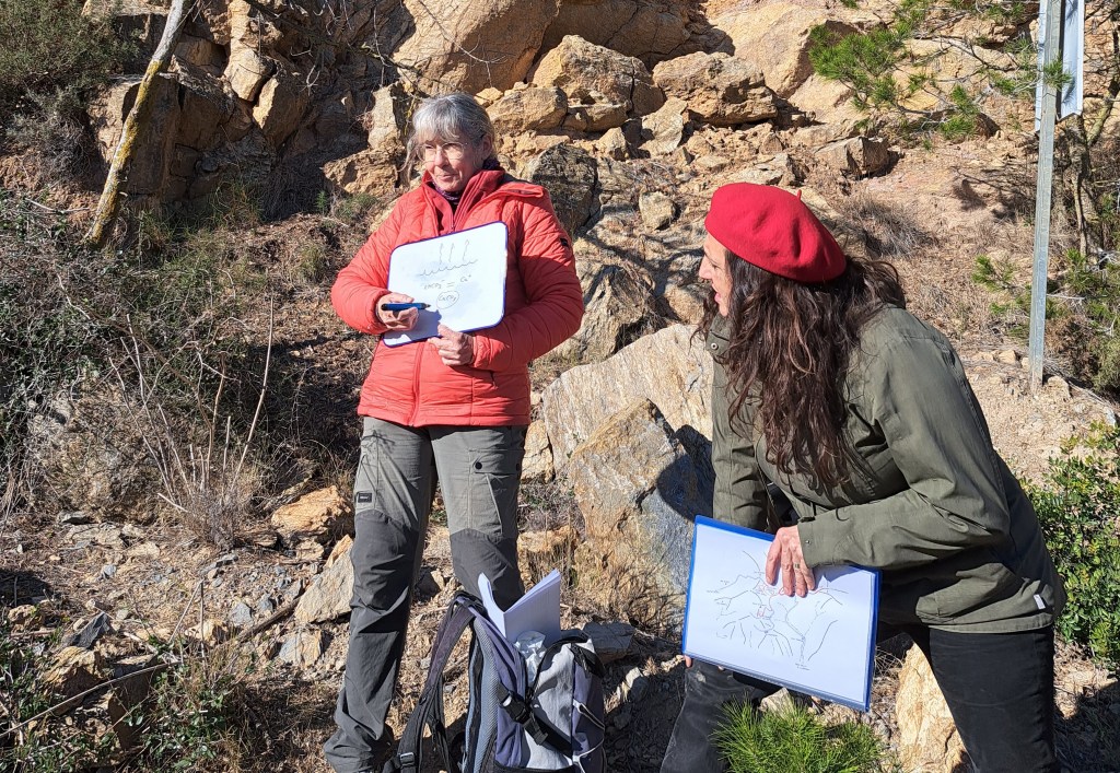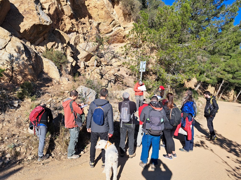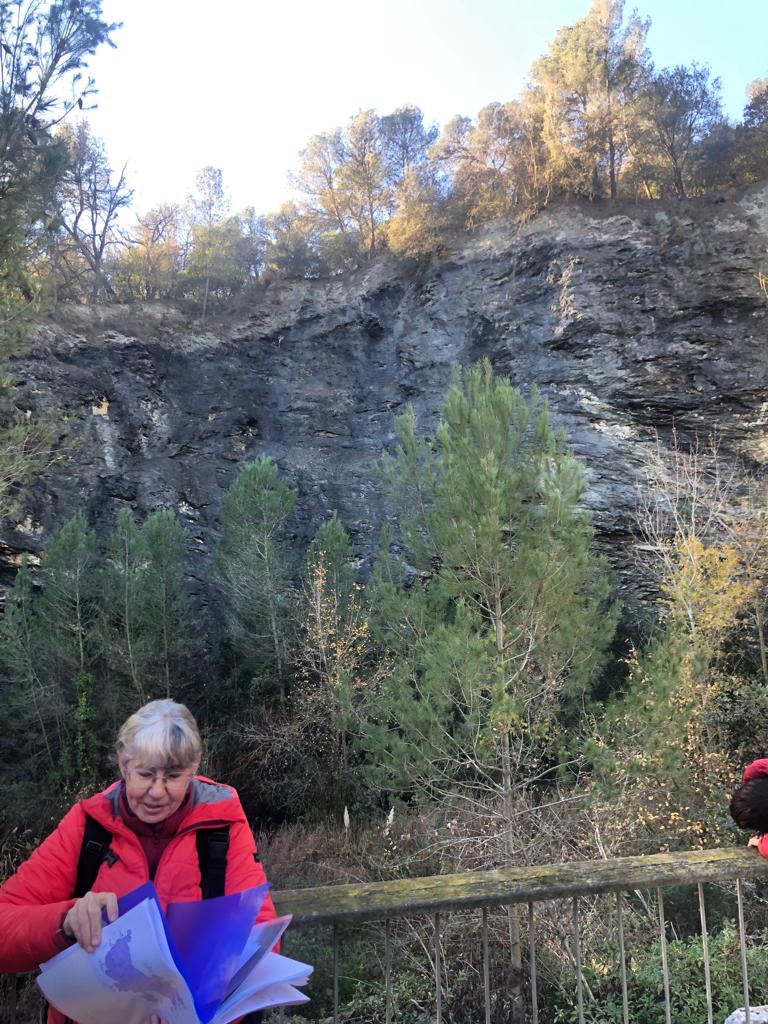 Com que la pedrera està a l’ombra i fa molt fred, ens traslladem ràpidament cap a la següent parada del dia: l’aflorament del plec. Aquí estem situats a les pedreres altes de l’antiga explotació i fabricació de ciment i, com estem a la cara sud sota el Puig d’Olorda, els sol ens escalfa i les explicacions no es fan tan dures.