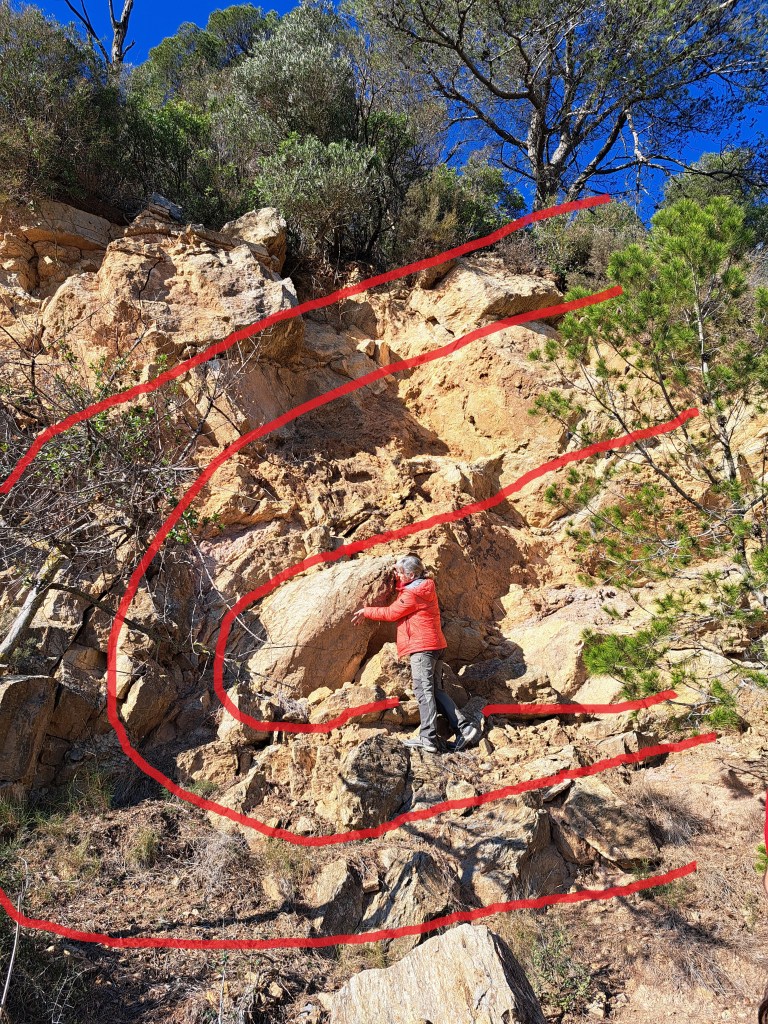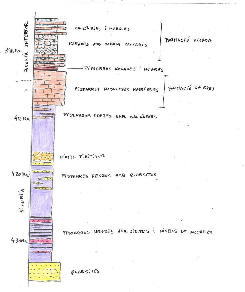 Aquí ens delectem amb l’observació d’un gran paquet de calcàries i margues, anomenat Formació Olorda, del Devonià inferior, format fa uns 395 milions d’anys per la unió dels ions bicarbonat (2HCO3¯) i calci (Ca2+) que donen lloc carbonat de calci (CaCO3), que ésinsoluble i es diposita i consolida damunt la plataforma continental com qualsevol altra calcària.