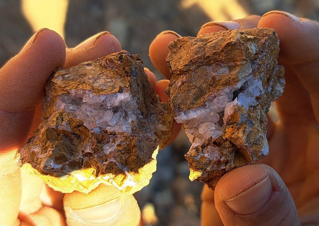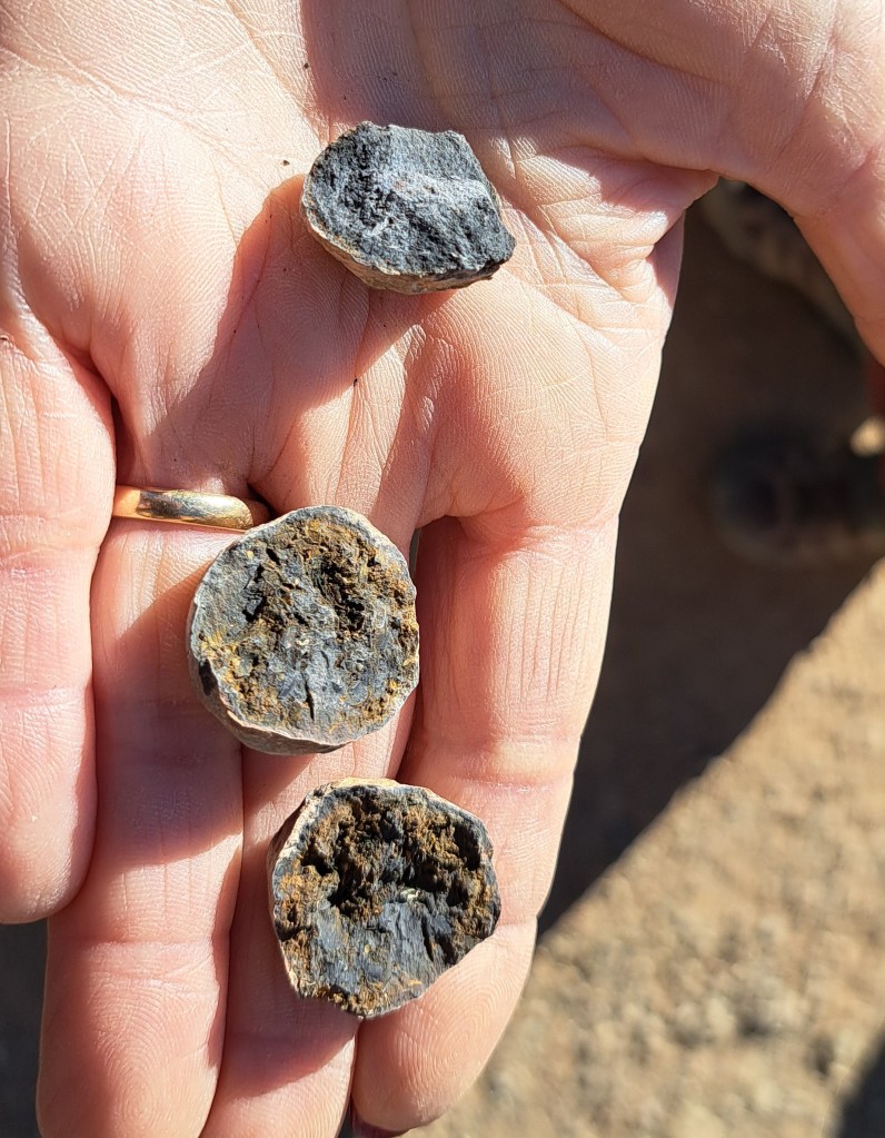 Com tenim temps i la temperatura és molt bona, ens posem a deambular per l’aflorament a la recerca d’alguna cosa interessant i, a fe que n’apareixen unes quantes: bonics cristalls de calcita, tiges de crinoideus, nòduls amb nuclis de minerals…