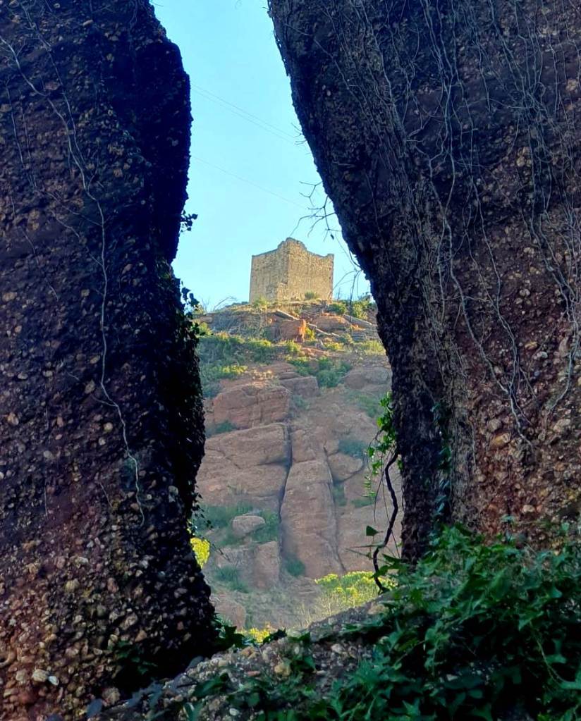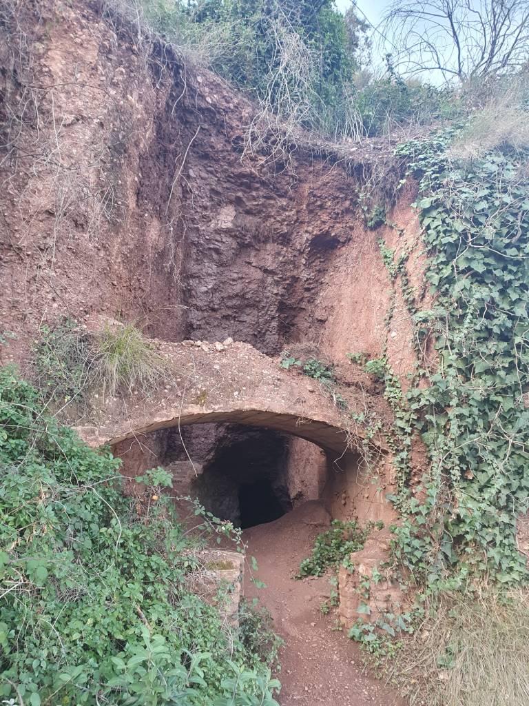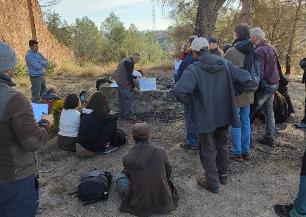 Pel camí fem diverses parades per a observar coses interessants i, sobretot, per descansar una mica. Com que la zona va patir un incendi forestal el juliol del 2021, ara alguns dels elements que visitarem, desgraciadament, es veuen molt millor. Així, fem la primera parada a tocar d’una antiga mina d’aigua excavada just al contacte entre els conglomerats (materials permeables) i les pissarres (materials impermeables).