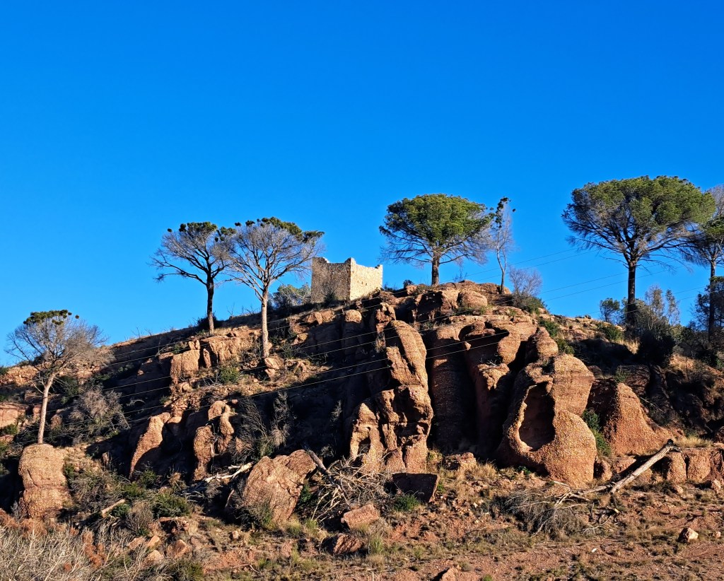 Des d’aquí veiem, sobre un turó conglomeràtic a l’altra banda del barranc, la Torre del Clos, de possible origen romà i relacionat amb el cèlebre Pont del Diable, que va ser punt de vigilància del congost del Llobregat durant la Guerra dels Segadors (s. XVII) i a les guerres del Francès i Carlines (s. XVIII). La cosa curiosa és que està construïda amb carreus de color blanc extrets d’un petit aflorament de calcàries del Miocè que hi ha al cim.