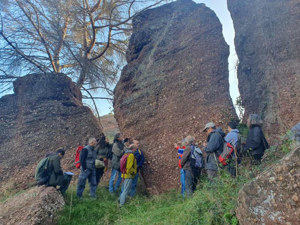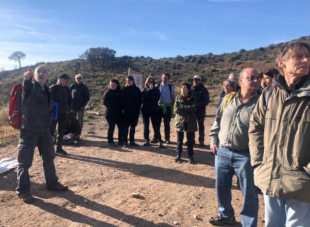 Aquí també observem l’aspecte de les pissarres, datades com a cambroordovicianes, grises, de tacte suau, superfícies brillants i que s’exfolien fàcilment. Fetes aquestes observacions, continuem el nostre ascens cap a la carena de la serra fins a un ample coll, conegut com a Quatre Camins, on fem la primera parada “oficial” del dia. Aquí, el recentment nomenat president del GMC, Frederic Varela, ens fa una amplíssima explicació de la història i del perquè aquest indret ha estat tan important al llarg dels temps.