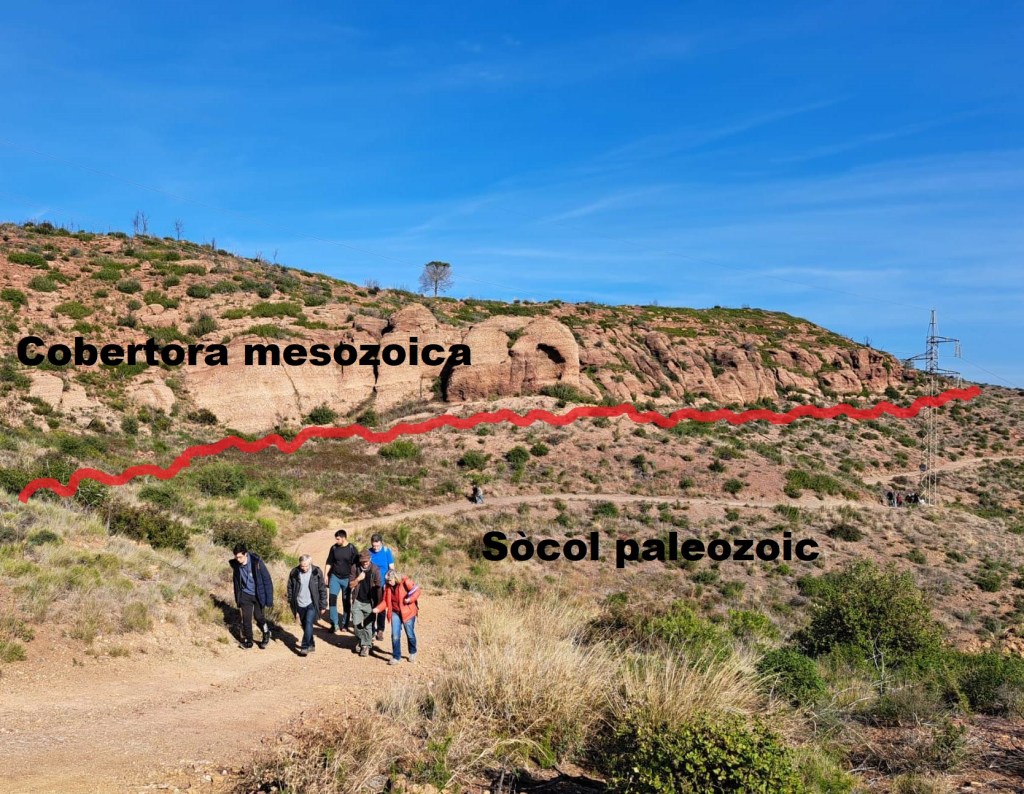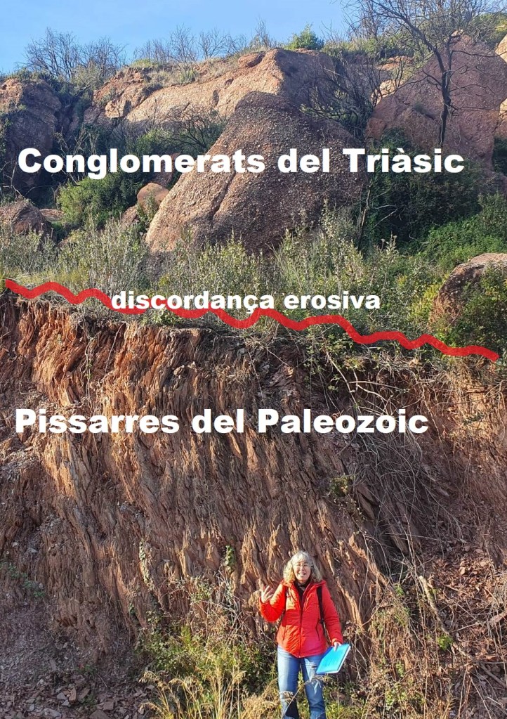 Seguim pujant tot deixant enrere la fossa del Penedès fins a un punt on es veu clarament el contacte discordant (discordança erosiva) entre les pissarres del Paleozoic i els conglomerats del Triàsic, contacte que marca el canvi de dues eres geològiques: la Primària i la Secundària. Aquest límit tan important també diferencia dues menes de geòlegs: els que estudien el sòcol paleozoic i els que estudien la cobertora mesozoica.
