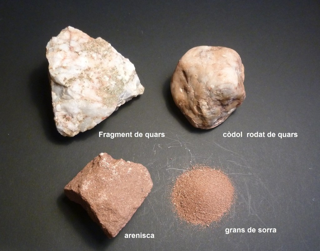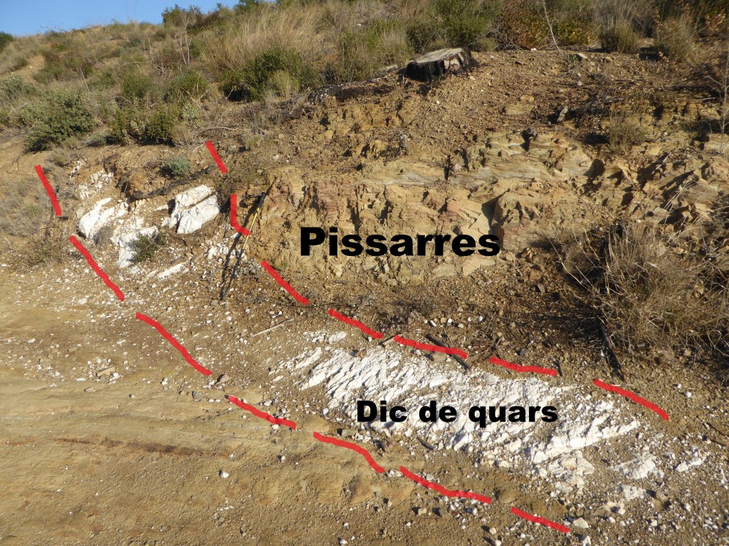 Després anem a observar un vistós dic de quars que talla aquestes pissarres, cosa que evidencia que es va intruir posteriorment ja que està relacionat amb els batòlits granítics posthercinians, dels quals en parlarem a la propera sortida a la Costa Brava. Aquests dics són els que proporcionen els blocs i fragments de quars que, un cop rodats, formen els còdols i grans de sorra dels conglomerats i gresos de la base del Triàsic.