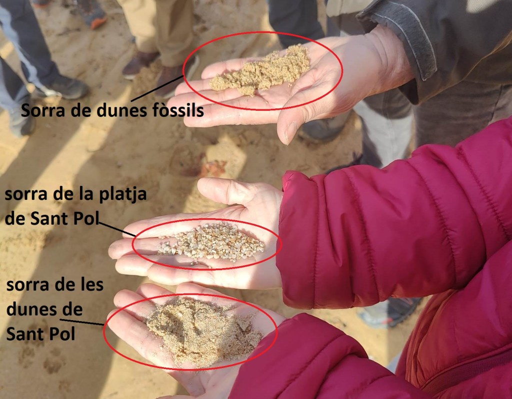 En un punt, travessem la línia de dunes, tot fixant-nos que estan formades per una sorra més fina que la que trobem a la platja. Fetes aquestes comprovacions, seguim per la platja en direcció llevant, tot esquivant el fort onatge, cap al Racó de s’Agaró, on comprovem que aquí la sorra torna a ser molt fina. La causa és que ens trobem damunt d’unes dunes fòssils que acompanyaven una platja que ara es troba submergida i on s’han trobat fragments de ceràmica d’època romana. I és que una línia de costa és un ambient sedimentari molt inestable.