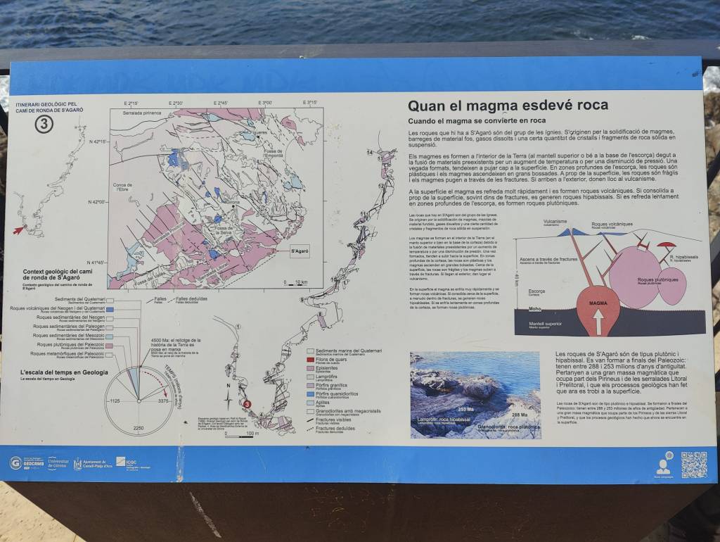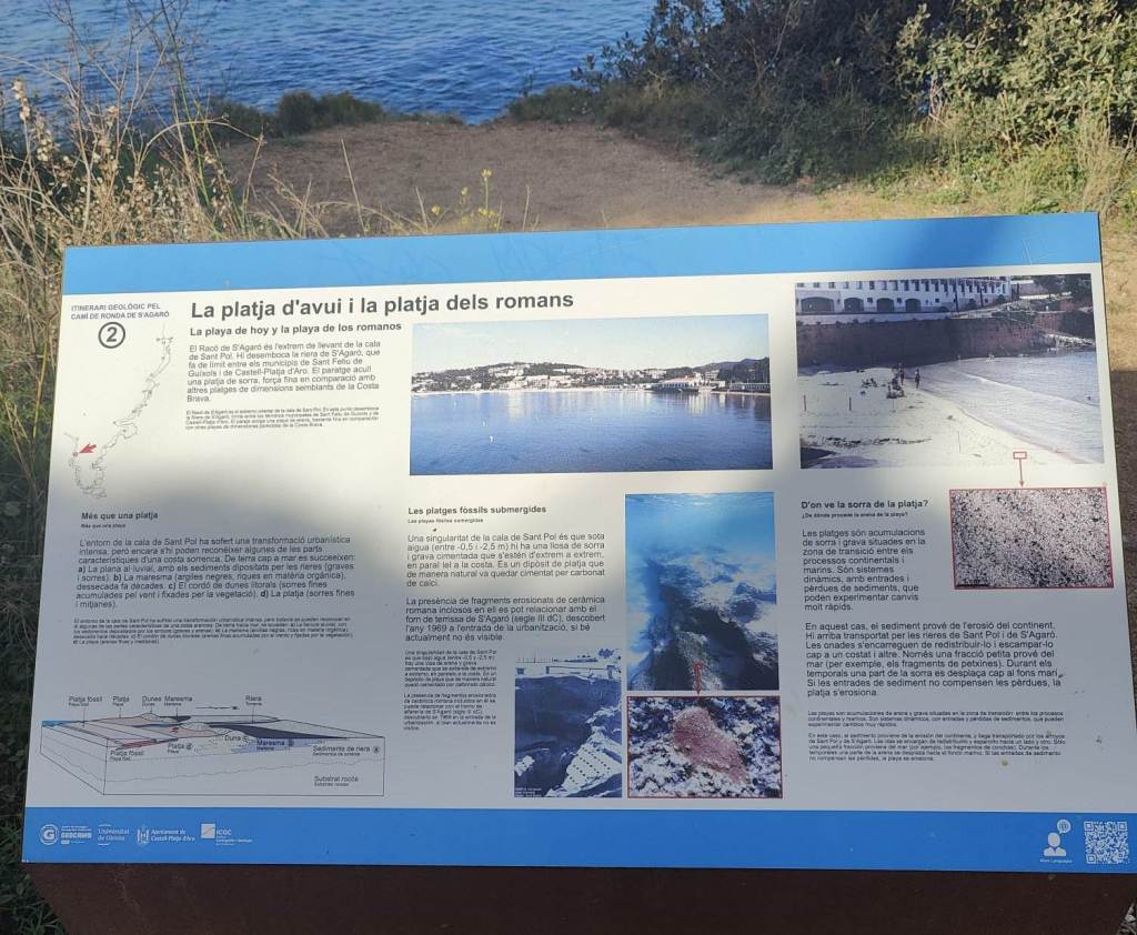 Després d’aquest incís, ens situem ja a l’inici del Camí de Ronda, on l’any 2015 i per iniciativa de l’Ajuntament de Castell-Platja d’Aro i desenvolupat pel Centre de Geologia i Cartografia Ambiental de la Universitat de Girona (amb la col·laboració de l’Institut Cartogràfic i Geològic de Catalunya), es van instal·lar 14 plafons que ens informaran tant de la història com de la geologia de la zona, dominada sobretot pels granitoides de finals del Paleozoic.