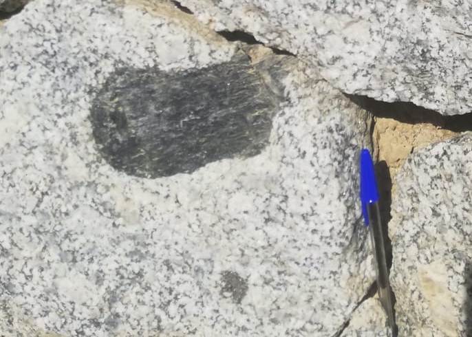 La següent parada està dedicada a conèixer l’origen de les taques fosques que de vegades es poden veure en els granitoides: es tracta dels enclavaments de roques màfiques, formades per minerals molt densos i foscos (piroxens, amfíbols, olivina, zircó, granat…) que cristal·litzen i es dipositen al fons de la cambra magmàtica però que, per moviments interns, es barregen amb la resta.
