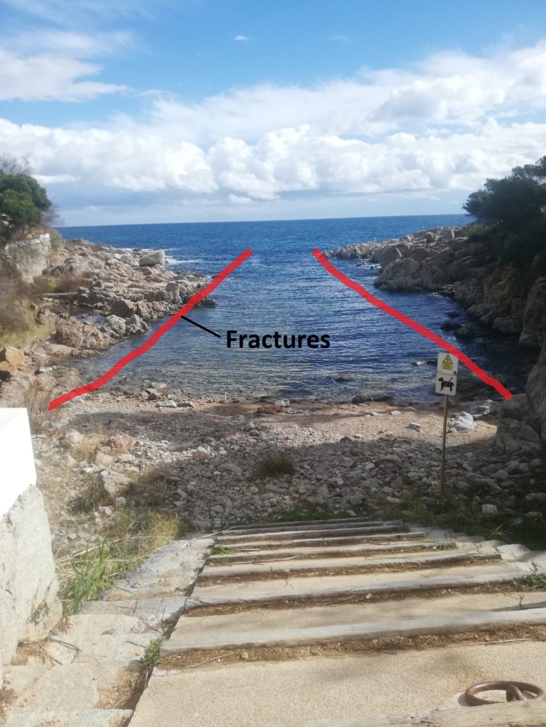 Continuant pel camí, podem comprovar com la densa xarxa de falles i diàclasis que afecten aquests materials són zones de debilitat que els agents erosius ataquen sense pietat tot donant caràcter a la Costa Brava, plena de cales i illots. L’atac químic és degut a que l’ambient salí deteriora els feldspats i plagiòclasis, que es transformen en argiles tot alliberant els grans de quars. Això és, els “granits” es transformen en una pols sorrenca, el sauló, fàcilment transportable pels agents físics (pluja, onatge, vent…).