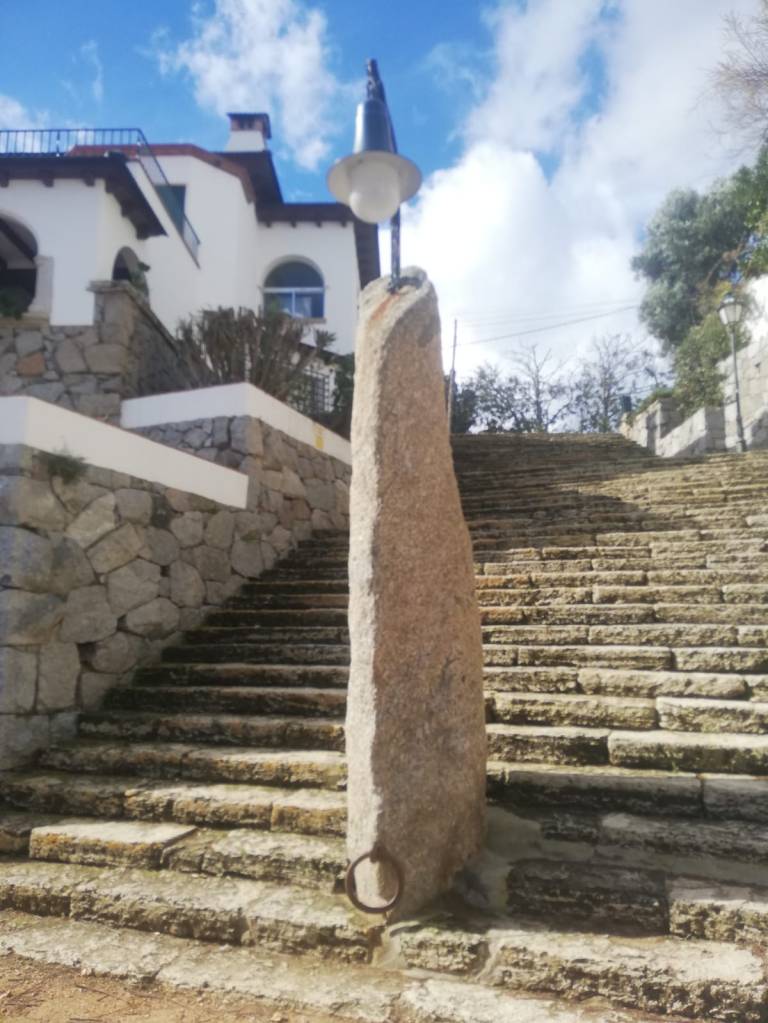 Així, arribem a un punt on, en una placeta, podem veure i tocar de prop aquestes roques ígnies magmàtiques (o plutòniques) que normalment en diem “granits” però que en realitat les hauríem d’anomenar granitoides, ja que el granit (sensu stricto) és una roca amb una determinada proporció dels seus components (quars, feldspats i plagiòclasis), però la roca que més abunda aquí és la granodiorita, d’un color gris fosc i rica en quars, plagiòclasis i miques. Els veritables granits, que es poden veure formant el mur d’una casa, procedeixen d’una pedrera de Sant Feliu de Guíxols i tenen un color més clar i rosat per la presència d’ortosa (feldspat potàssic).