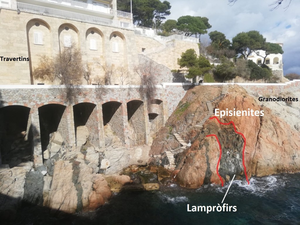 El cel es va ennuvolant per moments però a l’alçada de la Cala Vaques encara tenim temps d’explicar l’origen d’unes vistoses faixes negres (o verd fosc) que travessen les granodiorites: es tracta dels dics de lampròfirs, unes roques subvolcàniques (o hipoabissals), de composició bàsica i emplaçades entre finals del Triàsic i inicis del Juràssic, testimonis del trencament del gran continent Pangea i la formació de l’oceà Atlàntic.