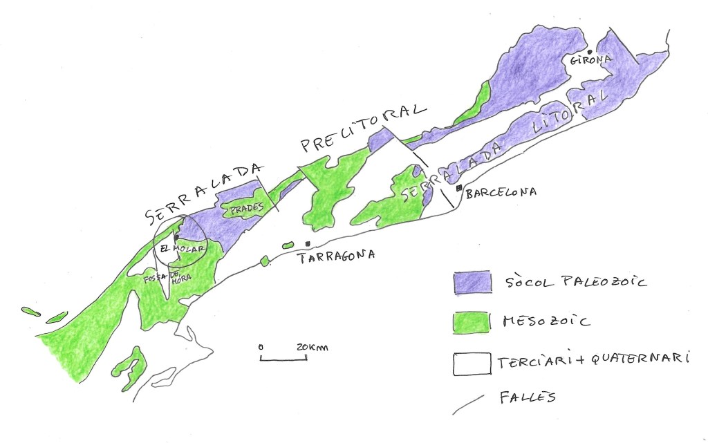 Estem sobre el sòcol paleozoic, concretament a l’interior d’un dic de pòrfir, de direcció E-W, relacionat amb la intrusió, a finals del Paleozoic, d’un batòlit granític (granodiorites) que aflora pels voltants de Falset. En aquest sector, tant el batòlit granític com el dic de pòrfir, s’encaixen dins les pissarres i gresos del Carbonífer inferior.