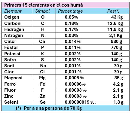 Taula 1.- Elements que componen el cos humà  (adaptat de https://sciencenotes.org/elements-in-the-human-body-and-what-they-do/)