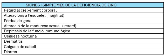 La deficiència de Zn ocasiona pèrdua de gana, dermatitis, pèrdua d’olfacte i gust, caiguda de cabell, retard en la cura de ferides, infeccions de repetició, pèrdua de visió en ambients foscos, retard maduratiu sexual i diarrees3. (Taula 3)
