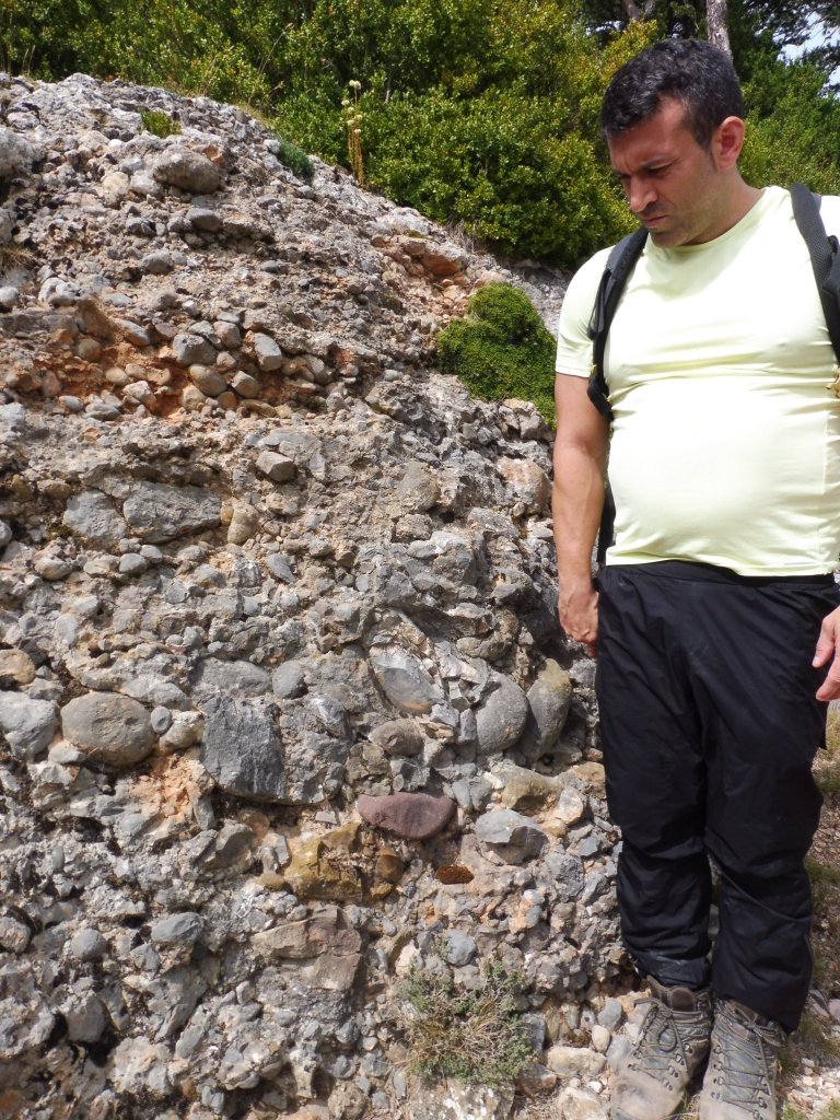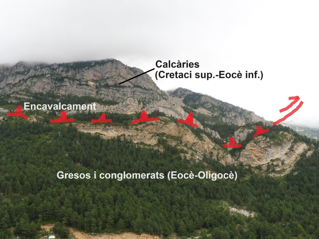 De tornada a Coll de Jou, on tenim els cotxes, encara tenim temps per a observar el formós encavalcament que, sota el Puig de les Morreres, posa en contacte el Cretaci superior i el Terciari (Paleocè i Eocè inferior) que formen part del Pirineu, amb els gresos i conglomerats de l’Eocè superior i Oligocè que formen part de la seva conca d’avantpaís i coneguda com Conca de l’Ebre.