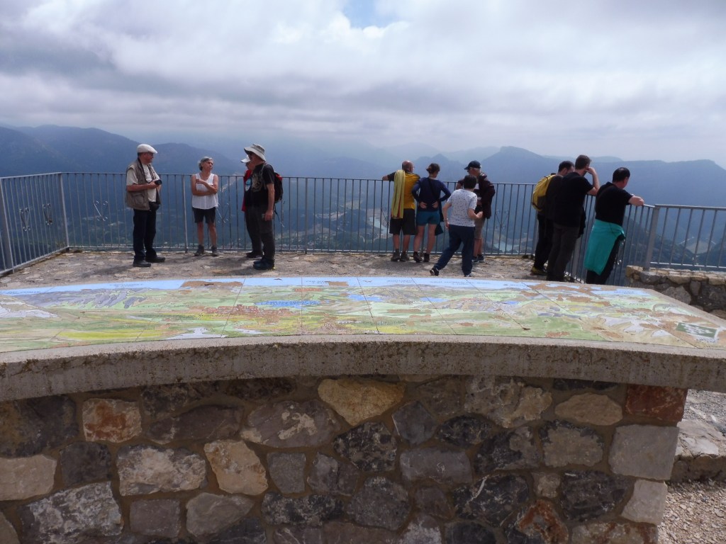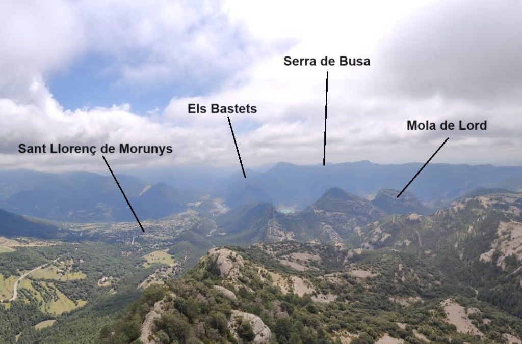 Així arribem a l’extrem d’una proa on hi ha el mirador, impressionant balcó presidit per una creu i una bonica (però una mica inútil…) taula d’orientació, i abocat a la vall del riu Cardener, les aigües del qual queden retingudes per l’embassament de la Llosa del Cavall, que s’estén entre la Mola de Lord i les serres dels Bastets i de Busa, avui totalment “desenfocades” per l’ambient boirós.