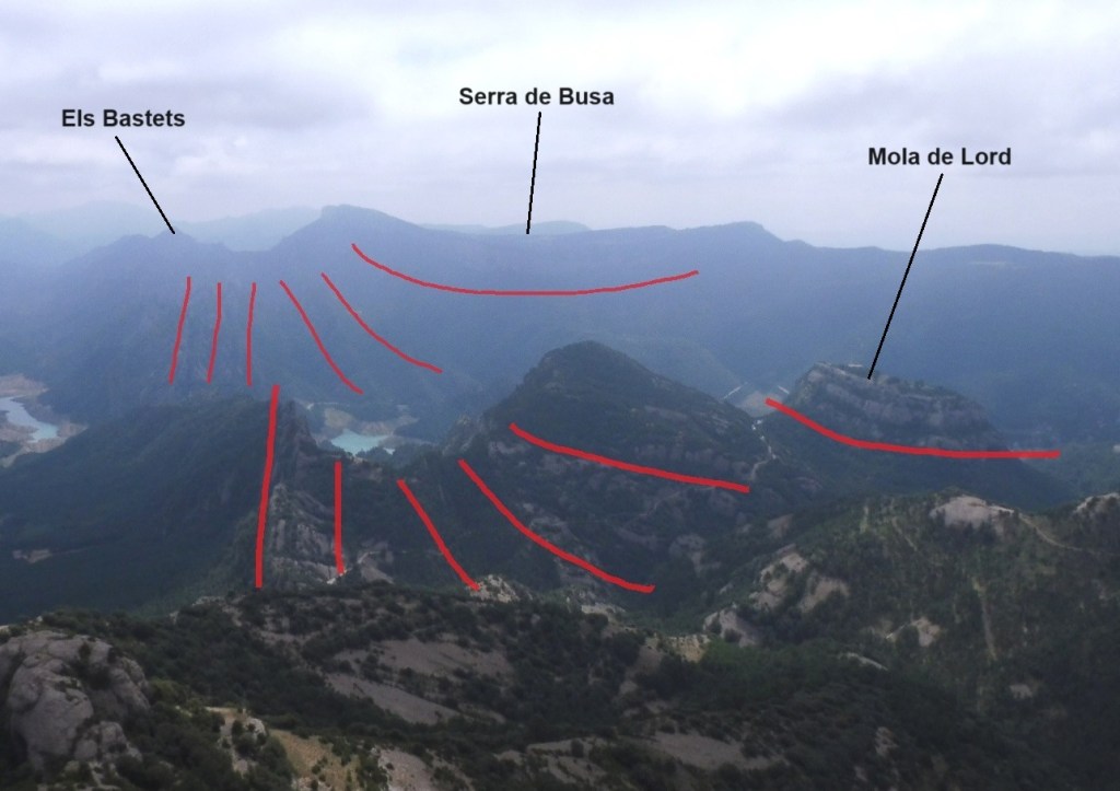 Després venen les explicacions de com els materials que es van dipositar a l’entorn d’aquella antiga “mar morta” (argiles, guixos i sals), que anomenem fàcies Keuper, van actuar com a lubrificant a l’hora de moure els mantells de corriment durant l’orogènia alpina que va tancar aquest aulacògen… i part de l’antic mar de Tetis. Les conseqüències del tal tancament, per la col·lisió de les plaques Ibèrica i Eurasiàtica, es poden veure al paisatge, entre la boira, en forma d’un bell exemple de discordança progressiva.