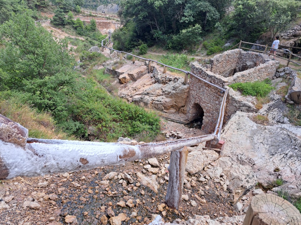 Seguim baixant per la gorja, on també veiem les ruïnes del que va ser un molí de pinso. Aquí també observem com un enginyós sistema de canalització, feta de fusta, porta l’aigua salada de la font cap a les eres d’evaporació modernes situades a la sortida de la gorja. A la roca de la gorja veiem diverses restes fòssils corresponents a rudistes, uns lamel·libranquis típics del Cretaci superior. També veiem les boniques flors de l’hipèric (Hypericum perforatum), una planta medicinal molt apreciada.