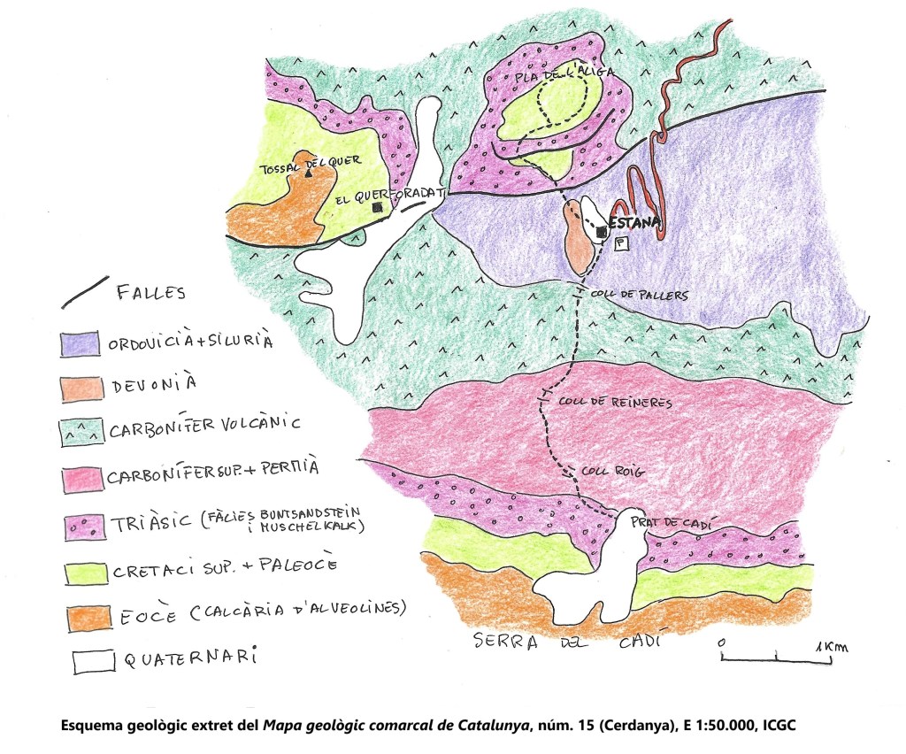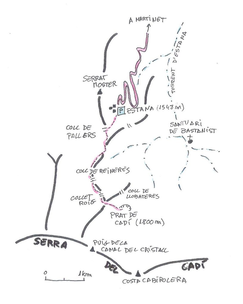 Aquests materials els trobem a mitja paret de la muralla del Cadí, però aquí els tenim a un nivell més baix per causa de la gran falla normal que hem travessat. Retornem a Estana pel mateix camí des d’on podem contemplar, a llevant, el Prat d’Aguiló i el Pas dels Gosolans, punt d’inici d’un proper itinerari per la muralla nord del Cadí.