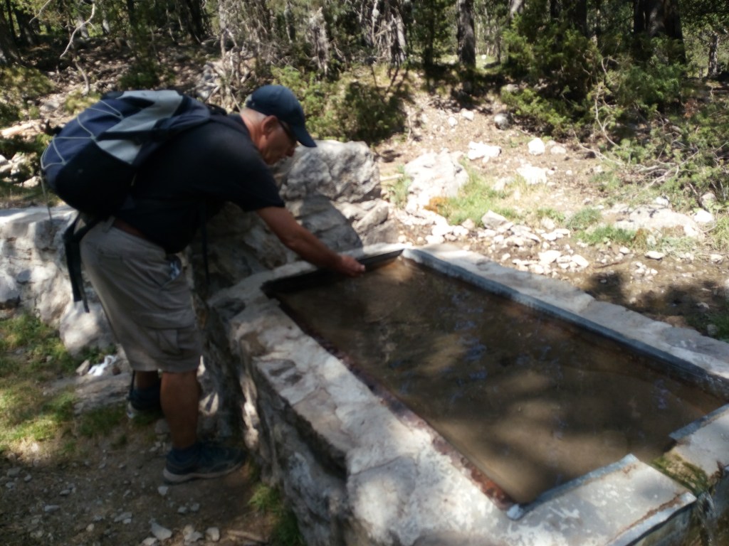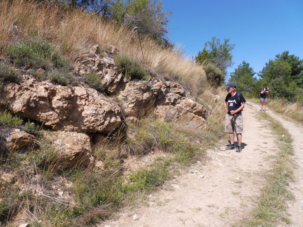 Anem pel camí marcat en groc i blanc fins a la font del Pi, d’aigua no gaire abundosa però molt fresca, la qual neix al peu del cingle segurament pel contacte entre les calcàries, que formen el cos de la serra i la seva base argilosa impermeable.