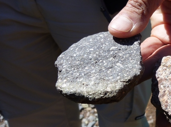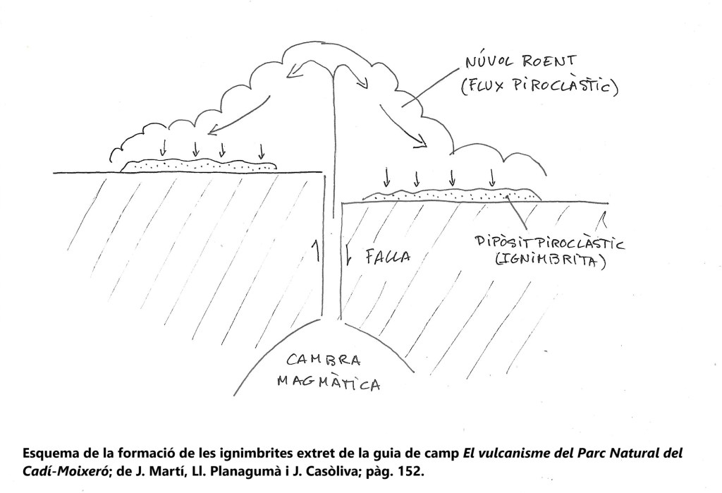 Comencem a caminar per un corriol marcat en groc i blanc, corresponent al PR-C121, que planeja tot travessant uns prats. Aquí ja trobem unes roques molt alterades de color gris-verdós, d’aspecte massiu, i amb uns puntets blancs: es tracta de les dacites del Carbonífer superior (Estefanià). Es diu que aquests materials representen un dipòsit piroclàstic (o ignimbrita), això és, dipositat per un núvol roent després d’una violenta explosió. Aquest seria un dels primers episodis del vulcanisme en aquesta zona, comparable al que va tenir lloc al Mount St. Helens (EEUU) l’any 1980.