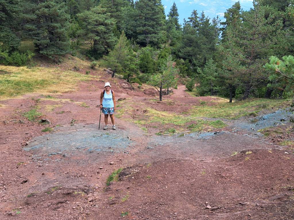 Un cop travessats els prats, el camí s’enfila de valent ja que el desnivell, de 350 metres, el farem quasi d’una sola tacada. Fins a mitja pujada anirem trepitjant les ignimbrites fins un punt on les roques canvien d’aspecte de manera brusca. A partir d’aquí trobarem capes alternades de lutites i gresos vermellosos que ressalten molt en el paisatge i fan que el camí sigui molt esglaonat perquè tot el conjunt cabussa fortament cap al sud També veiem algunes passades de conglomerats de còdols cantelluts (bretxes) ja que encara es poden trobar roques volcanoclàstiques.