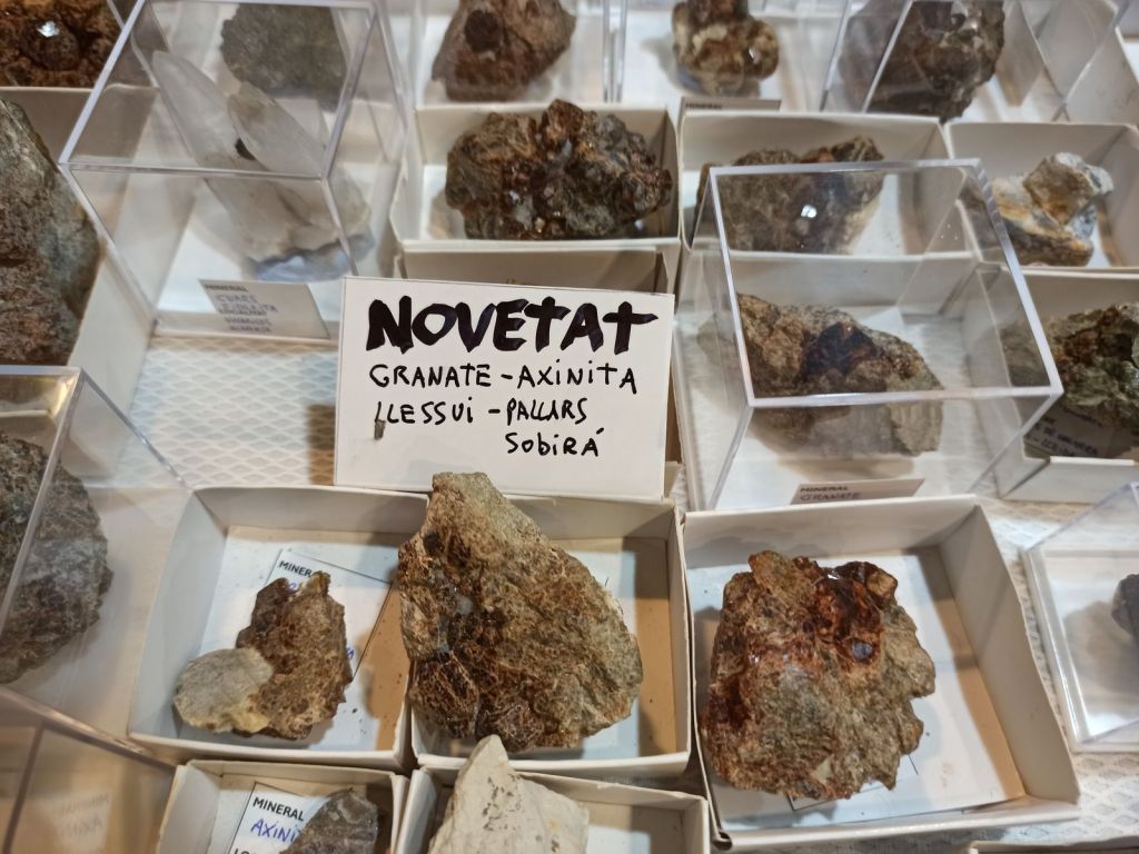 Unes de les mostres que més em van agradar i que eren novetat, van les andalusites de Coms de Jan, Ransol (Andorra) així com els exemplars de granat i axinita-(Fe) de l’Estany de Mainera, Llessuí. A més de gaudir de clàssics, com mostres de fluorita i calcita de la pedrera Berta, variscita del Turó de Montcada, microclina i quars ametista de Massabé (Sils), o emblemàtiques galenes, amb força anys, de la mina Atrevida (Vimbodí i Poblet).