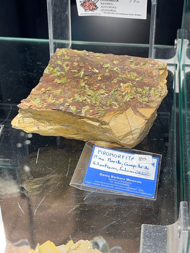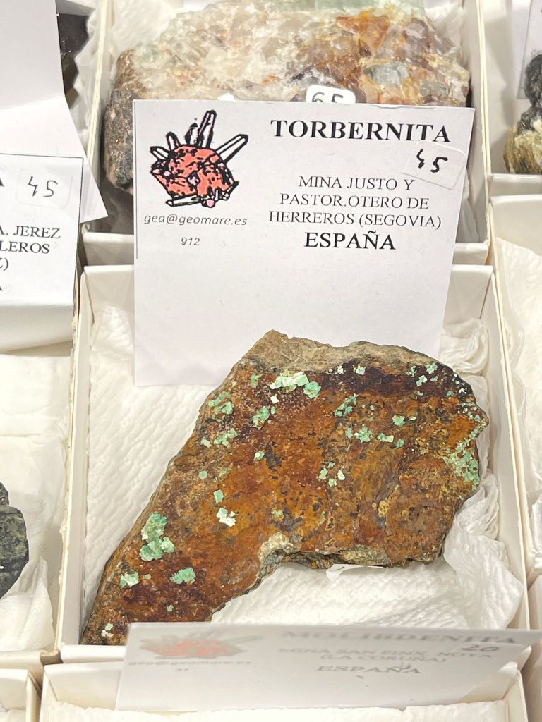Hi havia una molt bona representació de minerals de la Península Ibèrica. Com sempre, gran quantitat de fluorites i calcites d’Astúries: de la cantera “Llamas”, la mina “Emilio” o La Collada, entre moltes altres localitats. Del nord, destacar també una calcita rosa i pirita amb molt bon color de Villabona, scheelita de Boal, coure de la corta “Boinás”; torbernita de Vimianzo o anatasa de Peña Trevinca. Del sud i centre peninsular, es van poder veure mostres de sulfats molt ben conservats des dels anys noranta del Pozo ‘Alfredo’, Riotinto, Huelva, com ara voltaïta, romboclasa, calcantita o szomolnokita. Aragonita de gran mida de Los Molinillos, Minglanilla, o magnesita, dolomita i quars de la mina “San Pablo”, Sierra del Tablado, Borodia (Soria), que era una novetat. Com a curiositat, hi havia una piromorfita d’una localitat que no coneixia, la mina “Morilla”, Campillo de Salvatierra (Salamanca), i una torbernita de la mina “Justo y Pastor”, Otero de Herreros (Segovia), localitat ja desapareguda.