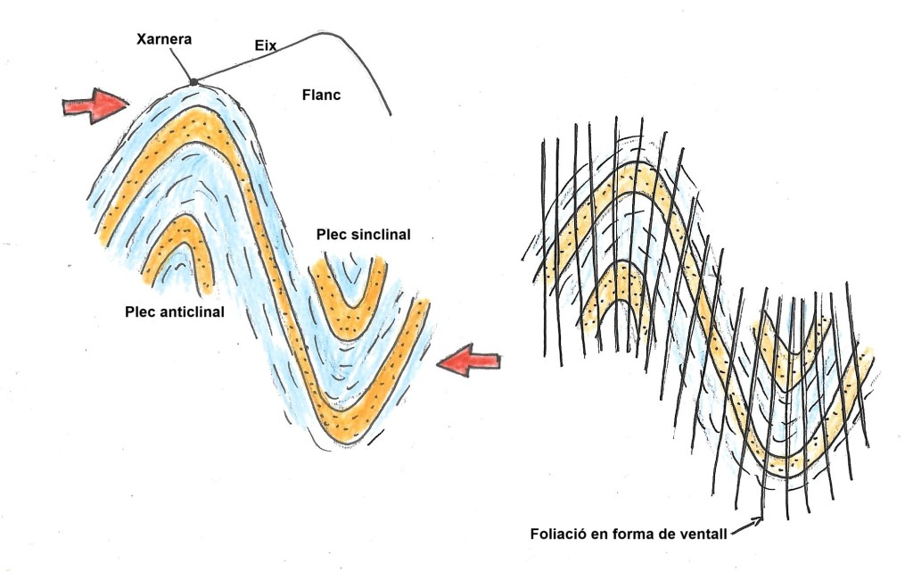 Aquests dos paquets de calcàries estan separats per un nivell de pissarres vermelloses que són les responsables de l’estructura tectònica en escates que s’observa en aquesta zona, ja que les pissarres tendeixen a exfoliar-se i “fluir”, mentre que les calcàries, més rígides, es trenquen i es desplacen per damunt d’aquests nivells pissarrosos que actuen com a nivell de desenganxament. Ara el sol s’ha tapat i fa un ventet glaçat molt molest; per això, ràpidament ens traslladem cap al vessant oest del Puig d’Olorda on hi ha l’anomenada Pedrera Vella de Cal Farrés i on esperem estar més arrecerats.