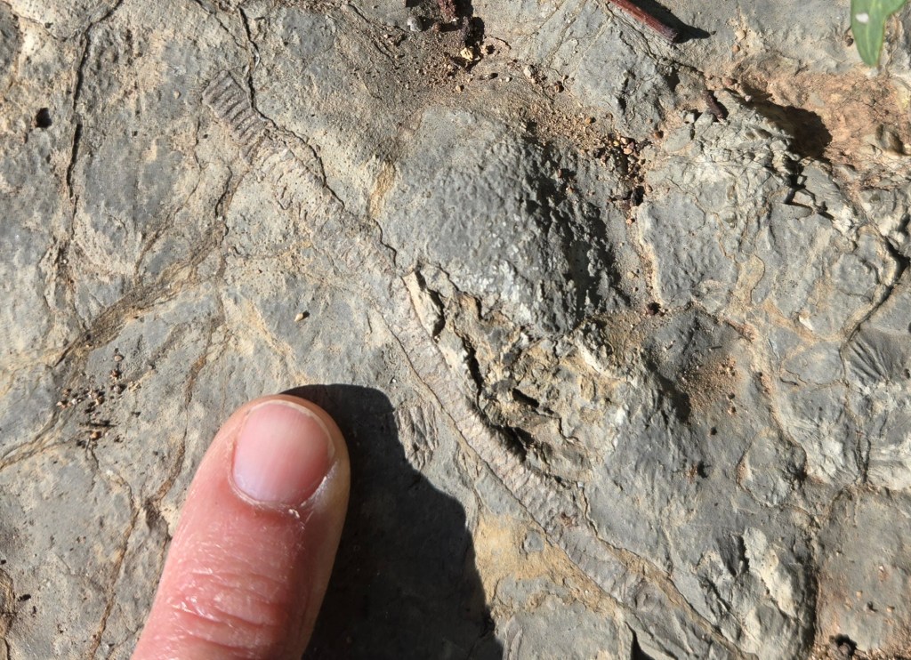 Sembla que el dia s’ha arreglat una mica i ja torna a lluir el sol. Per això optem per continuar la ruta tot seguint un corriol que ens porta fins a Cal Farrés, un petit mas al voltant del qual afloren les calcàries de La Creu, on trobem fòssils de crinoïdeus i ortoceràtids perquè aquestes calcàries es van dipositar sobre una plataforma continental poc profunda.
