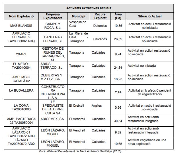 La darrera informació que es té de l’explotació, pel que fa a la seva activitat industrial, és que es tracta d’un dipòsit controlat de runes, l’empresa gestora del qual és Control de Runes, S.A., de Tarragona, mitjançant encàrrec de l’empresa Gestora de Runes, participada al 45% per administracions públiques i el 55% per capital privat. S’hi accepten tot tipus de residus procedents d’enderrocs, construcció o excavacions, a excepció d’aquells que poden suposar un risc per a la salut pública (amiant, líquids, drenatges…) o material orgànic.