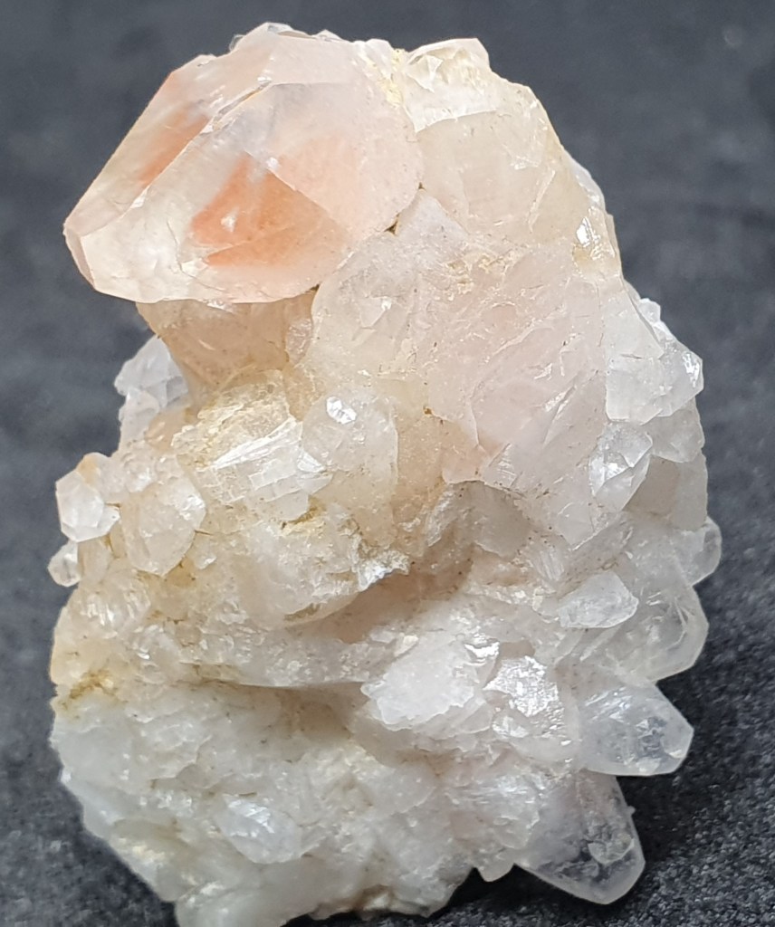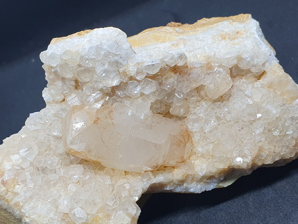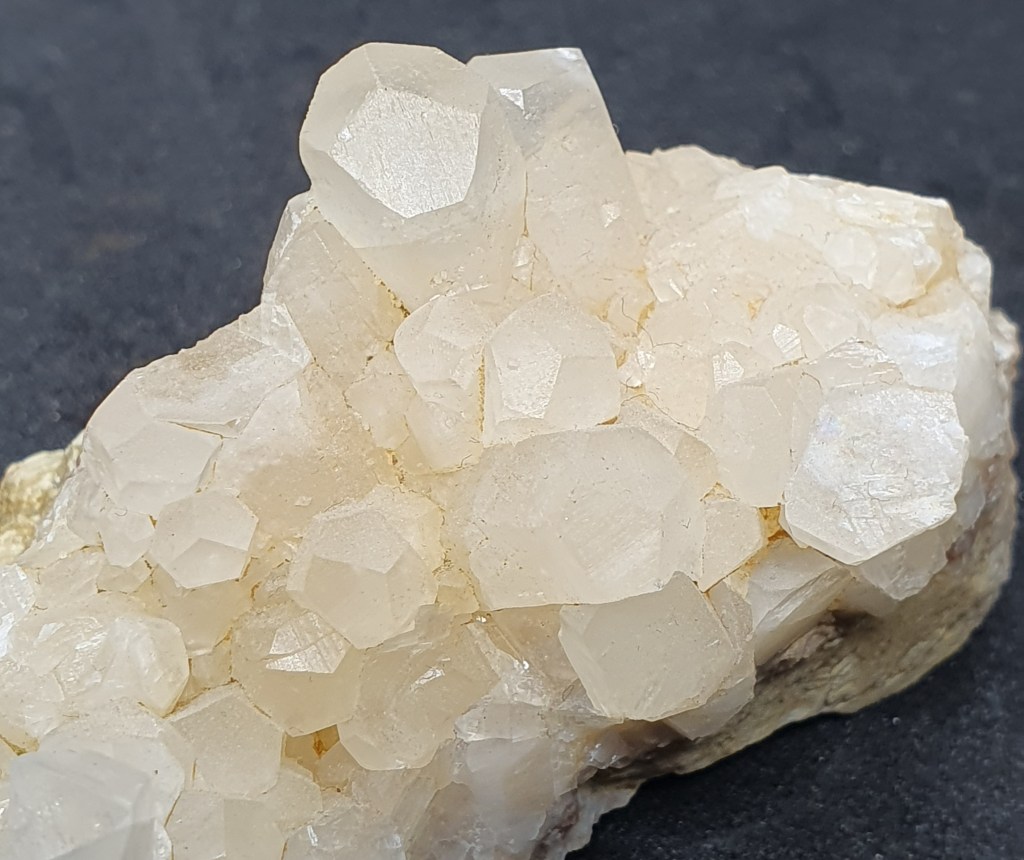 Fruit de la investigació a diferents zones de la pedrera, s’han trobat cristalls de calcita de diverses mides, des de mil·limètriques a centimètriques, en forma de cristalls escalenoèdrics (dent de gos) disposats a mode de drusa, i també amb la presentació tabular prismàtica (cap de clau). En ambdós casos se n’han trobat exemplars biterminats, si bé no ha estat aquesta la presentació més comuna. Solen tenir una bona transparència i gairebé sempre són incolors, tot i que en alguna ocasió s’han pogut observar inclusions vermelloses, possiblement a causa de la presència d’òxids de ferro.