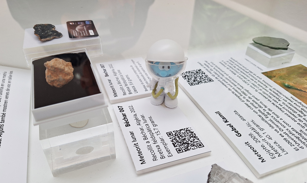 Els exemplars es troben disposats en dues vitrines on es poden veure nombrosos meteorits i algunes tectites. Tots són exemplars representatius de les diferents tipologies i permeten demostrar al visitant la utilitat de l’estudi d’aquests “fragments de cel” per a intentar explicar l’origen del nostre sistema solar i dels cossos que el formen i, per què no, de la vida.