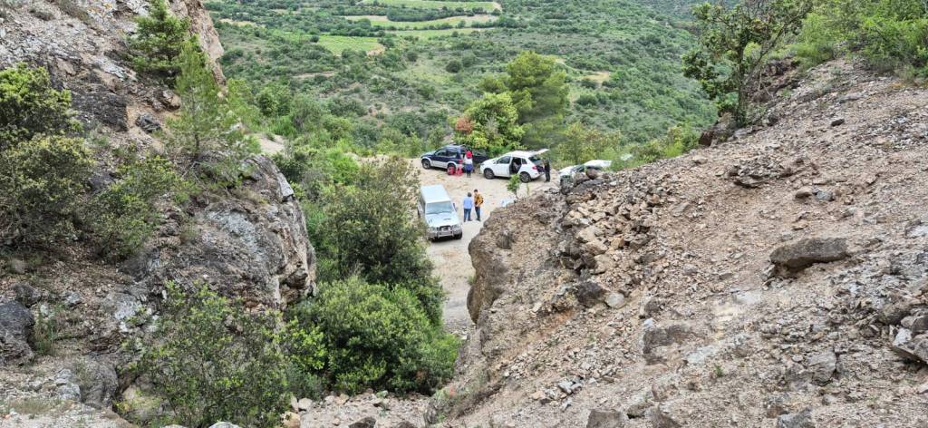 Això va significar haver de matinar força, doncs el punt de trobada era passat Perpinyà, ben a prop del Castell de Queribús. L’objectiu: conèixer la zona minera de Padern i Montgaillard, on es disposen diverses mines i explotacions a cel obert. Sense ser estrictament alta muntanya, sí que es troben, ambdós jaciments, relativament apartats de la carretera. Així doncs, un cop reunit el grup a una de les bodegues de la zona, es va iniciar el darrer tram; després d’una estona per carretera vam desviar-nos per una pista i, a partir d’aquí, muntanya amunt i embolica que fa fort!