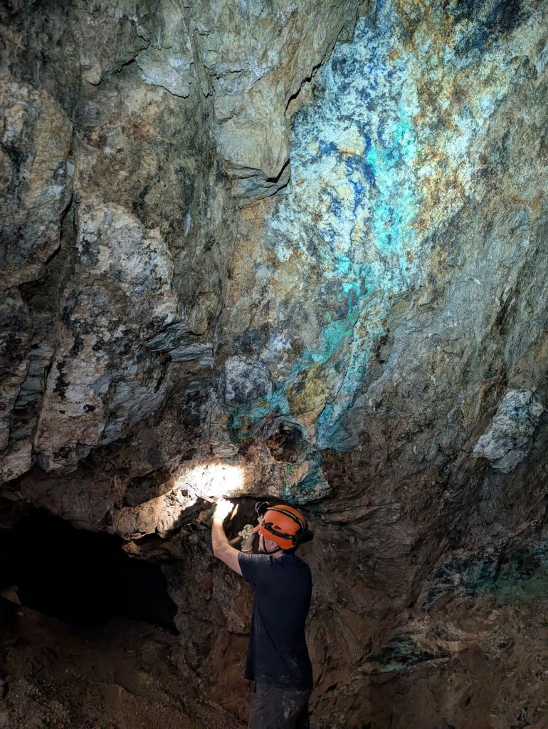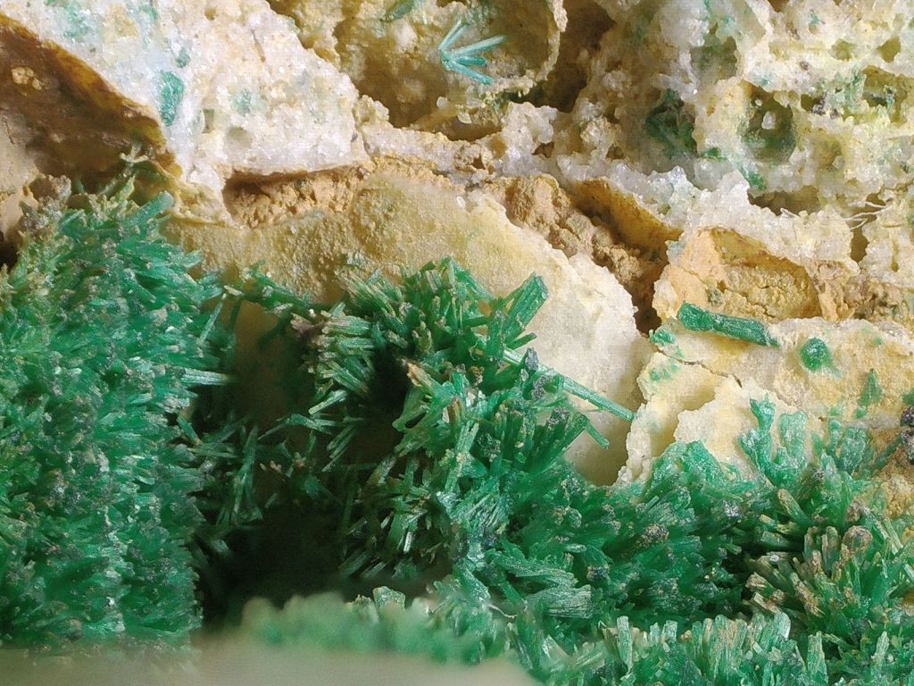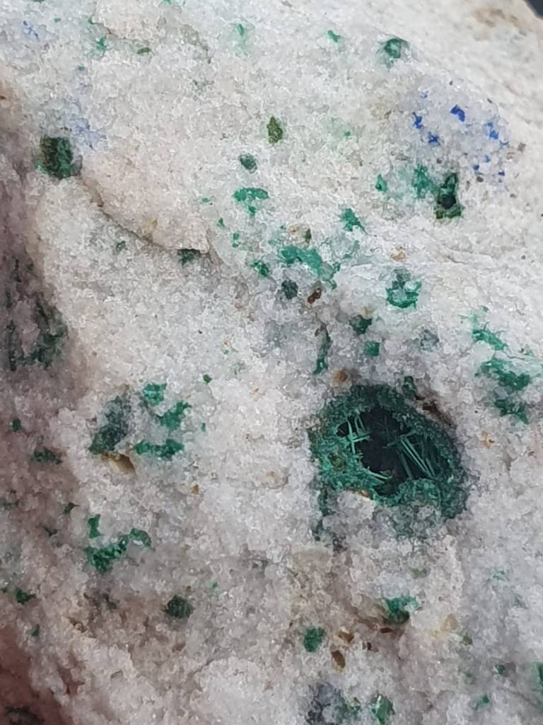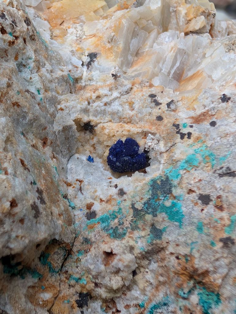 Després d’una bona estona investigant les parets, picant aquí i allà, vam canviar d’indret i, després d’una caminada camp a través, vam arribar a un gran circ, l’accés al qual es feia per un petit túnel que encara conservava rails per a les vagonetes: Saint Estèbe. El material venia a ser el mateix, però a la dolomia porosa s’hi podien trobar cristal·litzacions d’atzurita força més vistoses, amb petits cristalls prou interessants. Si bé a la zona també aflorava malaquita, aquesta no tenia un interès tan gran. Cuproadamita, i altres possibles espècies que requerien una anàlisi posterior amb el binocular, van completar la cerca.