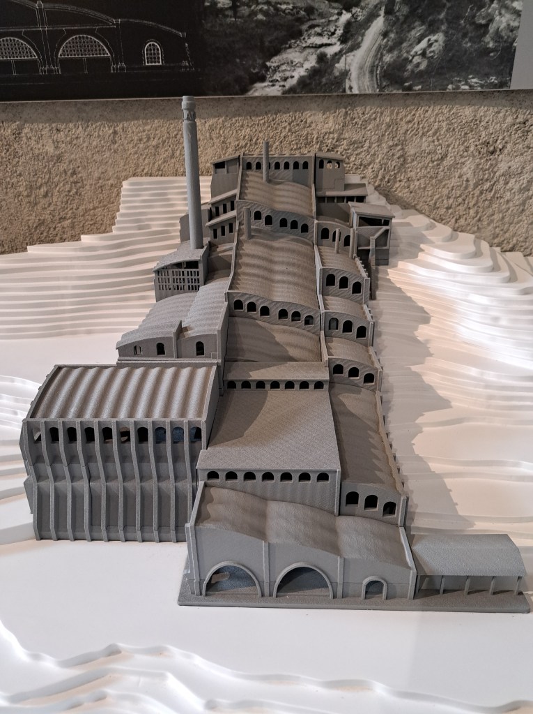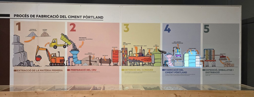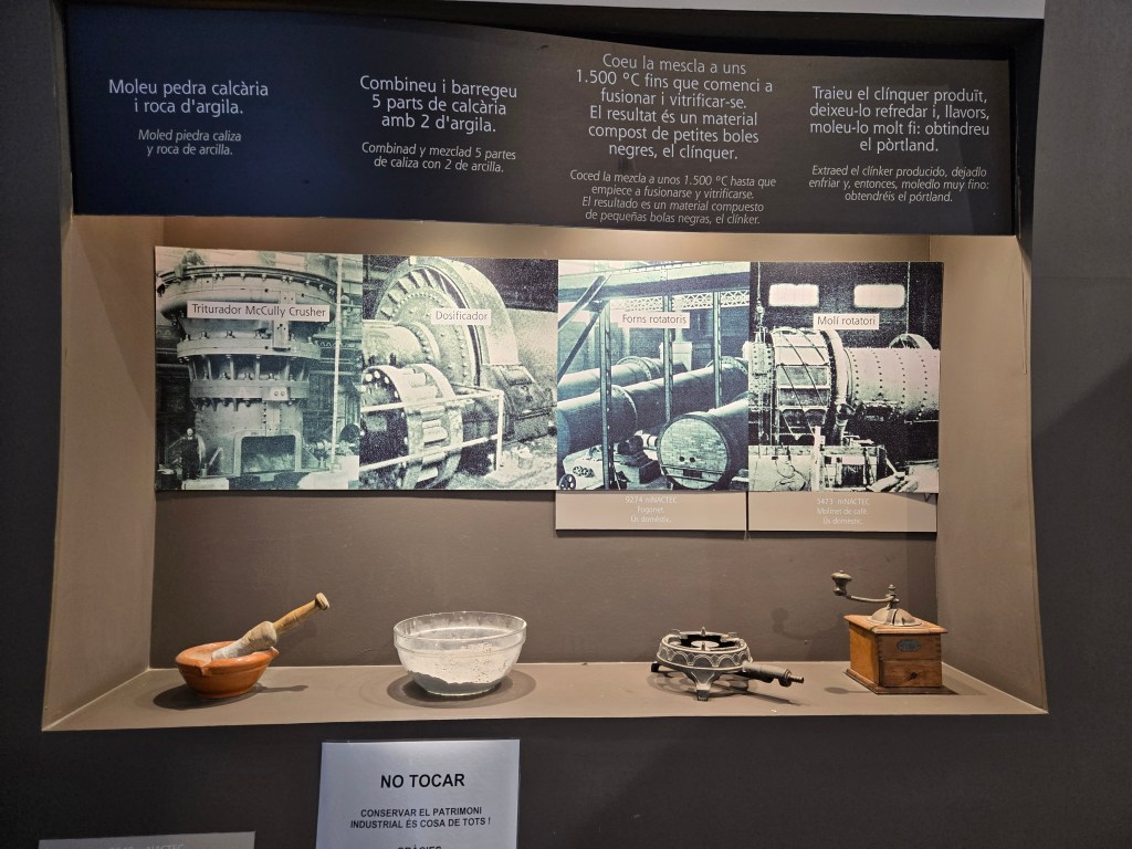 Amb una maqueta a escala de la fàbrica i fotos de l’època, se’ns explica que aquesta es va construir adaptant-se a les irregularitats del terreny de manera que, i malgrat tot, s’integrava en el paisatge. També va ser concebuda “en cascada” des de les pedreres de la part més alta fins a la sala d’ensacar a la part més baixa. Aquesta fàbrica aprofitava la força de la gravetat per a moure els materials, l’aigua del Llobregat per a moure les turbines i el carbó de la propera serra del Catllaràs per a produir el clínquer, resultat de la fusió de la mescla de calcàries i argiles a grans temperatures dins els forns rotatoris i que, un cop molt, es converteix en ciment.