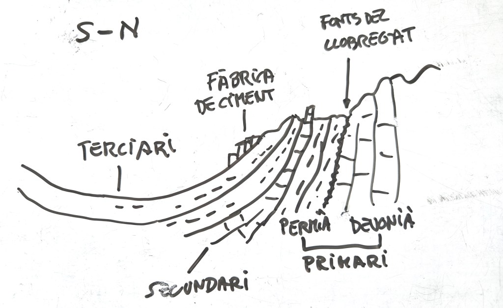 Ara toca anar a dinar, però abans completem les explicacions geològiques de la zona malgrat tenir les mateixes dificultats que la Srta. Marinette ja que no podem fer-les en ordre cronoestratigràfic com ens agradaria (dels materials més antics als més moderns) perquè el Mantell del Cadí té forma de gran sinclinal, anomenat Sinclinal de Ripoll, i ara ens trobem al seu flanc nord de manera que, conforme ens anem acostant a les Fonts del Llobregat anirem trobant cada cop materials més antics.