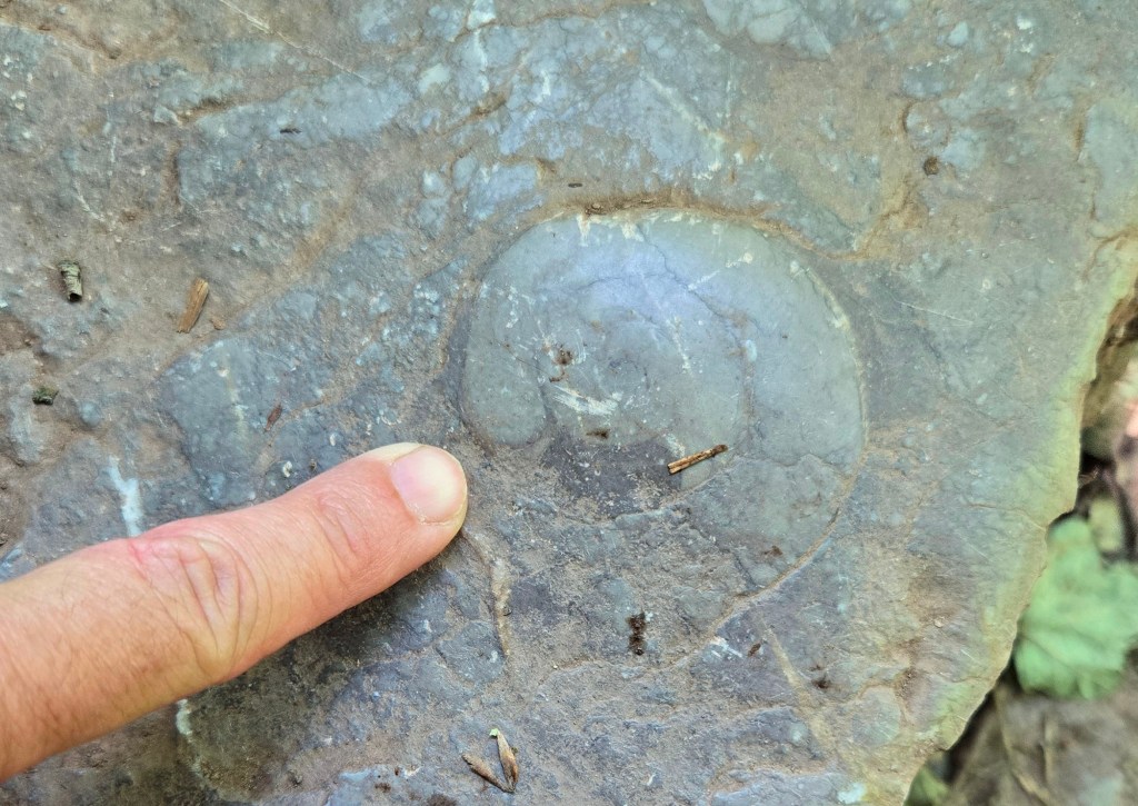 Ara sí, marxem cap a les Fonts del Llobregat per un ombrívol camí, ben arranjat amb escales i baranes de fusta, on afloren les calcàries de Devonià, que ja vam veure a la sortida de Sant Creu d’Olorda, i que són d’origen marí tal i com ho testimonia un pobre goniatítid (un cefalòpode amb closca enrotllada, anterior als ammonits) i que està polit per tanta gent que li passa pel damunt.