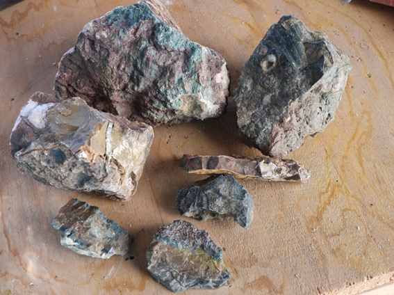 En una de les meves excursions fotogràfiques per la comarca de la Noguera vaig reparar en que entre guixos i argiles triàsiques hi havia a la pista uns nòduls d’ofita. En explorar el lloc d’on possiblement havien sortit aquests nòduls vaig veure que hi havia terra provinent de la disgregació de les ofites que, a la Noguera, la gent del país anomena brunall. A continuació, vaig trobar, entre els còdols i el brunall, uns minerals blavosos que a primera vista vaig prendre per aerinites força alterades però que, posteriorment, em vaig adonar que no es tractava d’aerinita, sinó que em va recordar a aquell mineral verdós que recobreix la part exterior de moltes de les geodes de quars que venen del Brasil. Preguntant, va sortir el nom de celadonita i per a més seguretat vaig fer analitzar una mostra. Els resultats van ser que es podia tractar tant de celadonita com de glauconita. Però com que la glauconita acostuma a presentar-se en roques calcàries mentre la celadonita és pròpia de roques ígnies, sembla que es pot tractar de celadonita.