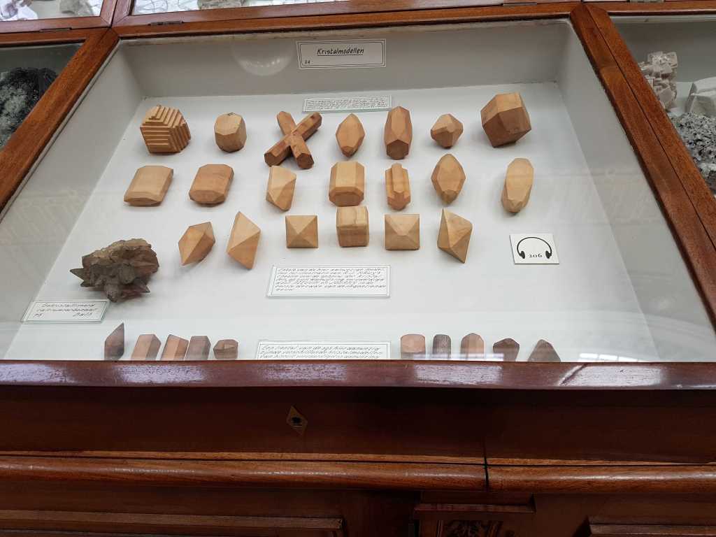 Una altra singularitat del Museu Teyler és que conserva la col·lecció més completa que existeix avui dels models cristal·logràfics de Haüy, un conjunt excepcional tant per la seva extensió com pel seu estat de conservació. René Just Haüy (1743–1822) és considerat el pare de la cristal·lografia. Va demostrar que els cristalls tenen una estructura interna regular i repetitiva i va formular el concepte de “llei de decreixement” per a explicar com les formes externes deriven d’unitats internes més simples. El seu Traité de Minéralogie (1801) incloïa gairebé 600 figures geomètriques que representaven aquestes formes cristal·lines. Per a fer comprensibles aquestes formes, Haüy va introduir models tridimensionals de fusta de perera, que permetien visualitzar simetries, angles i variacions morfològiques. Entre 1802 i 1804, Martinus van Marum —primer director del museu, com ja hem dit— va adquirir 597 models de fusta de perera produïts sota la supervisió de Haüy. D’aquests, 565 encara es conserven (foto 10).